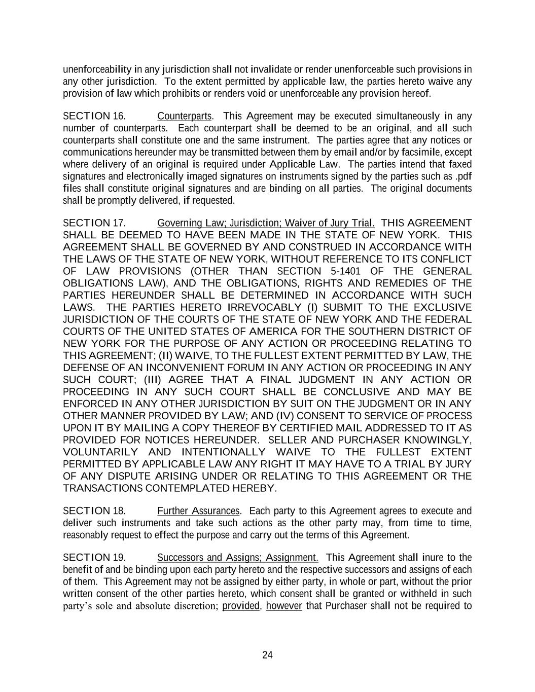 24 unenforceability in any jurisdiction shall not invalidate or render unenforceable such provisions in any other jurisdiction. To the extent permitted by applicable law, the parties hereto waive any provision of law which prohibits or renders void or unenforceable any provision hereof. SECTION 16. Counterparts. This Agreement may be executed simultaneously in any number of counterparts. Each counterpart shall be deemed to be an original, and all such counterparts shall constitute one and the same instrument. The parties agree that any notices or communications hereunder may be transmitted between them by email and/or by facsimile, except where delivery of an original is required under Applicable Law. The parties intend that faxed signatures and electronically imaged signatures on instruments signed by the parties such as .pdf files shall constitute original signatures and are binding on all parties. The original documents shall be promptly delivered, if requested. SECTION 17. Governing Law; Jurisdiction; Waiver of Jury Trial. THIS AGREEMENT SHALL BE DEEMED TO HAVE BEEN MADE IN THE STATE OF NEW YORK. THIS AGREEMENT SHALL BE GOVERNED BY AND CONSTRUED IN ACCORDANCE WITH THE LAWS OF THE STATE OF NEW YORK, WITHOUT REFERENCE TO ITS CONFLICT OF LAW PROVISIONS (OTHER THAN SECTION 5-1401 OF THE GENERAL OBLIGATIONS LAW), AND THE OBLIGATIONS, RIGHTS AND REMEDIES OF THE PARTIES HEREUNDER SHALL BE DETERMINED IN ACCORDANCE WITH SUCH LAWS. THE PARTIES HERETO IRREVOCABLY (I) SUBMIT TO THE EXCLUSIVE JURISDICTION OF THE COURTS OF THE STATE OF NEW YORK AND THE FEDERAL COURTS OF THE UNITED STATES OF AMERICA FOR THE SOUTHERN DISTRICT OF NEW YORK FOR THE PURPOSE OF ANY ACTION OR PROCEEDING RELATING TO THIS AGREEMENT; (II) WAIVE, TO THE FULLEST EXTENT PERMITTED BY LAW, THE DEFENSE OF AN INCONVENIENT FORUM IN ANY ACTION OR PROCEEDING IN ANY SUCH COURT; (III) AGREE THAT A FINAL JUDGMENT IN ANY ACTION OR PROCEEDING IN ANY SUCH COURT SHALL BE CONCLUSIVE AND MAY BE ENFORCED IN ANY OTHER JURISDICTION BY SUIT ON THE JUDGMENT OR IN ANY OTHER MANNER PROVIDED BY LAW; AND (IV) CONSENT TO SERVICE OF PROCESS UPON IT BY MAILING A COPY THEREOF BY CERTIFIED MAIL ADDRESSED TO IT AS PROVIDED FOR NOTICES HEREUNDER. SELLER AND PURCHASER KNOWINGLY, VOLUNTARILY AND INTENTIONALLY WAIVE TO THE FULLEST EXTENT PERMITTED BY APPLICABLE LAW ANY RIGHT IT MAY HAVE TO A TRIAL BY JURY OF ANY DISPUTE ARISING UNDER OR RELATING TO THIS AGREEMENT OR THE TRANSACTIONS CONTEMPLATED HEREBY. SECTION 18. Further Assurances. Each party to this Agreement agrees to execute and deliver such instruments and take such actions as the other party may, from time to time, reasonably request to effect the purpose and carry out the terms of this Agreement. SECTION 19. Successors and Assigns; Assignment. This Agreement shall inure to the benefit of and be binding upon each party hereto and the respective successors and assigns of each of them. This Agreement may not be assigned by either party, in whole or part, without the prior written consent of the other parties hereto, which consent shall be granted or withheld in such party’s sole and absolute discretion; provided, however that Purchaser shall not be required to