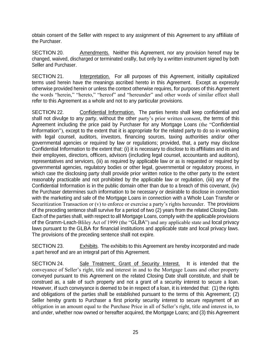 25 obtain consent of the Seller with respect to any assignment of this Agreement to any affiliate of the Purchaser. SECTION 20. Amendments. Neither this Agreement, nor any provision hereof may be changed, waived, discharged or terminated orally, but only by a written instrument signed by both Seller and Purchaser. SECTION 21. Interpretation. For all purposes of this Agreement, initially capitalized terms used herein have the meanings ascribed hereto in this Agreement. Except as expressly otherwise provided herein or unless the context otherwise requires, for purposes of this Agreement the words “herein,” “hereto,” “hereof” and “hereunder” and other words of similar effect shall refer to this Agreement as a whole and not to any particular provisions. SECTION 22. Confidential Information. The parties hereto shall keep confidential and shall not divulge to any party, without the other party’s prior written consent, the terms of this Agreement including the price paid by Purchaser for any Mortgage Loans (the “Confidential Information”), except to the extent that it is appropriate for the related party to do so in working with legal counsel, auditors, investors, financing sources, taxing authorities and/or other governmental agencies or required by law or regulations; provided, that, a party may disclose Confidential Information to the extent that: (i) it is necessary to disclose to its affiliates and its and their employees, directors, officers, advisors (including legal counsel, accountants and auditors), representatives and servicers, (ii) as required by applicable law or as is requested or required by governmental agencies, regulatory bodies or other legal, governmental or regulatory process, in which case the disclosing party shall provide prior written notice to the other party to the extent reasonably practicable and not prohibited by the applicable law or regulation, (iii) any of the Confidential Information is in the public domain other than due to a breach of this covenant, (iv) the Purchaser determines such information to be necessary or desirable to disclose in connection with the marketing and sale of the Mortgage Loans in connection with a Whole Loan Transfer or Securitization Transaction or (v) to enforce or exercise a party’s rights hereunder. The provisions of the preceding sentence shall survive for a period of two (2) years from the related Closing Date. Each of the parties shall, with respect to all Mortgage Loans, comply with the applicable provisions of the Gramm-Leach-Bliley Act of 1999 (the “GLBA”) and any applicable state and local privacy laws pursuant to the GLBA for financial institutions and applicable state and local privacy laws. The provisions of the preceding sentence shall not expire. SECTION 23. Exhibits. The exhibits to this Agreement are hereby incorporated and made a part hereof and are an integral part of this Agreement. SECTION 24. Sale Treatment; Grant of Security Interest. It is intended that the conveyance of Seller’s right, title and interest in and to the Mortgage Loans and other property conveyed pursuant to this Agreement on the related Closing Date shall constitute, and shall be construed as, a sale of such property and not a grant of a security interest to secure a loan. However, if such conveyance is deemed to be in respect of a loan, it is intended that: (1) the rights and obligations of the parties shall be established pursuant to the terms of this Agreement; (2) Seller hereby grants to Purchaser a first priority security interest to secure repayment of an obligation in an amount equal to the Purchase Price in all of Seller’s right, title and interest in, to and under, whether now owned or hereafter acquired, the Mortgage Loans; and (3) this Agreement
