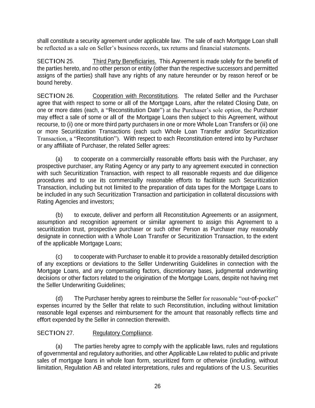 26 shall constitute a security agreement under applicable law. The sale of each Mortgage Loan shall be reflected as a sale on Seller’s business records, tax returns and financial statements. SECTION 25. Third Party Beneficiaries. This Agreement is made solely for the benefit of the parties hereto, and no other person or entity (other than the respective successors and permitted assigns of the parties) shall have any rights of any nature hereunder or by reason hereof or be bound hereby. SECTION 26. Cooperation with Reconstitutions. The related Seller and the Purchaser agree that with respect to some or all of the Mortgage Loans, after the related Closing Date, on one or more dates (each, a “Reconstitution Date”) at the Purchaser’s sole option, the Purchaser may effect a sale of some or all of the Mortgage Loans then subject to this Agreement, without recourse, to (i) one or more third party purchasers in one or more Whole Loan Transfers or (ii) one or more Securitization Transactions (each such Whole Loan Transfer and/or Securitization Transaction, a “Reconstitution”). With respect to each Reconstitution entered into by Purchaser or any affiliate of Purchaser, the related Seller agrees: (a) to cooperate on a commercially reasonable efforts basis with the Purchaser, any prospective purchaser, any Rating Agency or any party to any agreement executed in connection with such Securitization Transaction, with respect to all reasonable requests and due diligence procedures and to use its commercially reasonable efforts to facilitate such Securitization Transaction, including but not limited to the preparation of data tapes for the Mortgage Loans to be included in any such Securitization Transaction and participation in collateral discussions with Rating Agencies and investors; (b) to execute, deliver and perform all Reconstitution Agreements or an assignment, assumption and recognition agreement or similar agreement to assign this Agreement to a securitization trust, prospective purchaser or such other Person as Purchaser may reasonably designate in connection with a Whole Loan Transfer or Securitization Transaction, to the extent of the applicable Mortgage Loans; (c) to cooperate with Purchaser to enable it to provide a reasonably detailed description of any exceptions or deviations to the Seller Underwriting Guidelines in connection with the Mortgage Loans, and any compensating factors, discretionary bases, judgmental underwriting decisions or other factors related to the origination of the Mortgage Loans, despite not having met the Seller Underwriting Guidelines; (d) The Purchaser hereby agrees to reimburse the Seller for reasonable “out-of-pocket” expenses incurred by the Seller that relate to such Reconstitution, including without limitation reasonable legal expenses and reimbursement for the amount that reasonably reflects time and effort expended by the Seller in connection therewith. SECTION 27. Regulatory Compliance. (a) The parties hereby agree to comply with the applicable laws, rules and regulations of governmental and regulatory authorities, and other Applicable Law related to public and private sales of mortgage loans in whole loan form, securitized form or otherwise (including, without limitation, Regulation AB and related interpretations, rules and regulations of the U.S. Securities