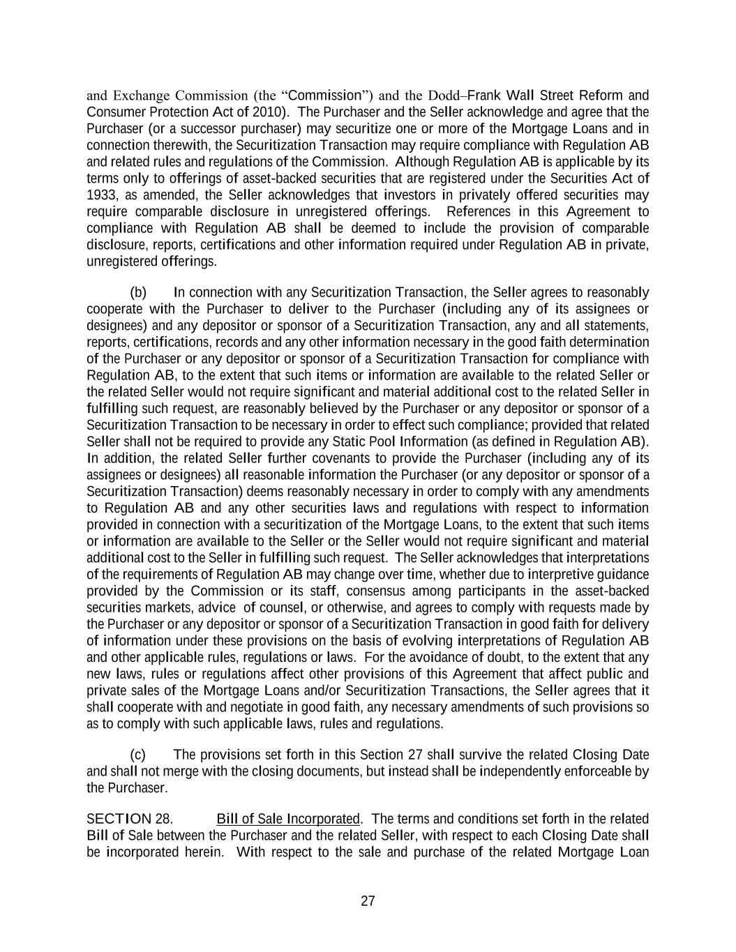 27 and Exchange Commission (the “Commission”) and the Dodd–Frank Wall Street Reform and Consumer Protection Act of 2010). The Purchaser and the Seller acknowledge and agree that the Purchaser (or a successor purchaser) may securitize one or more of the Mortgage Loans and in connection therewith, the Securitization Transaction may require compliance with Regulation AB and related rules and regulations of the Commission. Although Regulation AB is applicable by its terms only to offerings of asset-backed securities that are registered under the Securities Act of 1933, as amended, the Seller acknowledges that investors in privately offered securities may require comparable disclosure in unregistered offerings. References in this Agreement to compliance with Regulation AB shall be deemed to include the provision of comparable disclosure, reports, certifications and other information required under Regulation AB in private, unregistered offerings. (b) In connection with any Securitization Transaction, the Seller agrees to reasonably cooperate with the Purchaser to deliver to the Purchaser (including any of its assignees or designees) and any depositor or sponsor of a Securitization Transaction, any and all statements, reports, certifications, records and any other information necessary in the good faith determination of the Purchaser or any depositor or sponsor of a Securitization Transaction for compliance with Regulation AB, to the extent that such items or information are available to the related Seller or the related Seller would not require significant and material additional cost to the related Seller in fulfilling such request, are reasonably believed by the Purchaser or any depositor or sponsor of a Securitization Transaction to be necessary in order to effect such compliance; provided that related Seller shall not be required to provide any Static Pool Information (as defined in Regulation AB). In addition, the related Seller further covenants to provide the Purchaser (including any of its assignees or designees) all reasonable information the Purchaser (or any depositor or sponsor of a Securitization Transaction) deems reasonably necessary in order to comply with any amendments to Regulation AB and any other securities laws and regulations with respect to information provided in connection with a securitization of the Mortgage Loans, to the extent that such items or information are available to the Seller or the Seller would not require significant and material additional cost to the Seller in fulfilling such request. The Seller acknowledges that interpretations of the requirements of Regulation AB may change over time, whether due to interpretive guidance provided by the Commission or its staff, consensus among participants in the asset-backed securities markets, advice of counsel, or otherwise, and agrees to comply with requests made by the Purchaser or any depositor or sponsor of a Securitization Transaction in good faith for delivery of information under these provisions on the basis of evolving interpretations of Regulation AB and other applicable rules, regulations or laws. For the avoidance of doubt, to the extent that any new laws, rules or regulations affect other provisions of this Agreement that affect public and private sales of the Mortgage Loans and/or Securitization Transactions, the Seller agrees that it shall cooperate with and negotiate in good faith, any necessary amendments of such provisions so as to comply with such applicable laws, rules and regulations. (c) The provisions set forth in this Section 27 shall survive the related Closing Date and shall not merge with the closing documents, but instead shall be independently enforceable by the Purchaser. SECTION 28. Bill of Sale Incorporated. The terms and conditions set forth in the related Bill of Sale between the Purchaser and the related Seller, with respect to each Closing Date shall be incorporated herein. With respect to the sale and purchase of the related Mortgage Loan