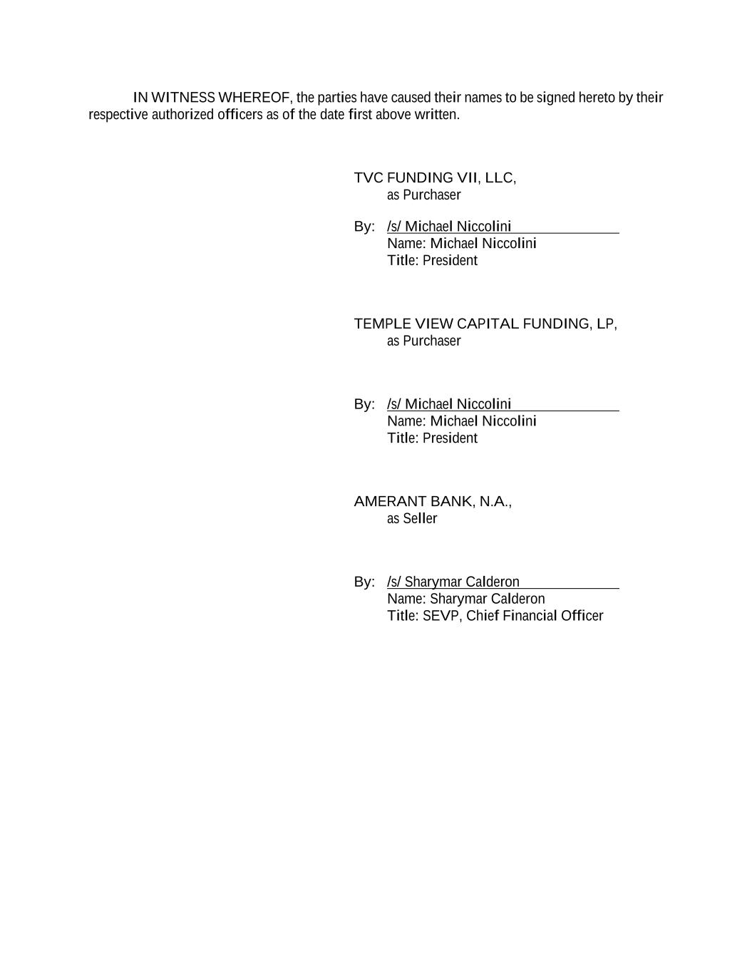IN WITNESS WHEREOF, the parties have caused their names to be signed hereto by their respective authorized officers as of the date first above written. TVC FUNDING VII, LLC, as Purchaser By: /s/ Michael Niccolini Name: Michael Niccolini Title: President TEMPLE VIEW CAPITAL FUNDING, LP, as Purchaser By: /s/ Michael Niccolini Name: Michael Niccolini Title: President AMERANT BANK, N.A., as Seller By: /s/ Sharymar Calderon Name: Sharymar Calderon Title: SEVP, Chief Financial Officer