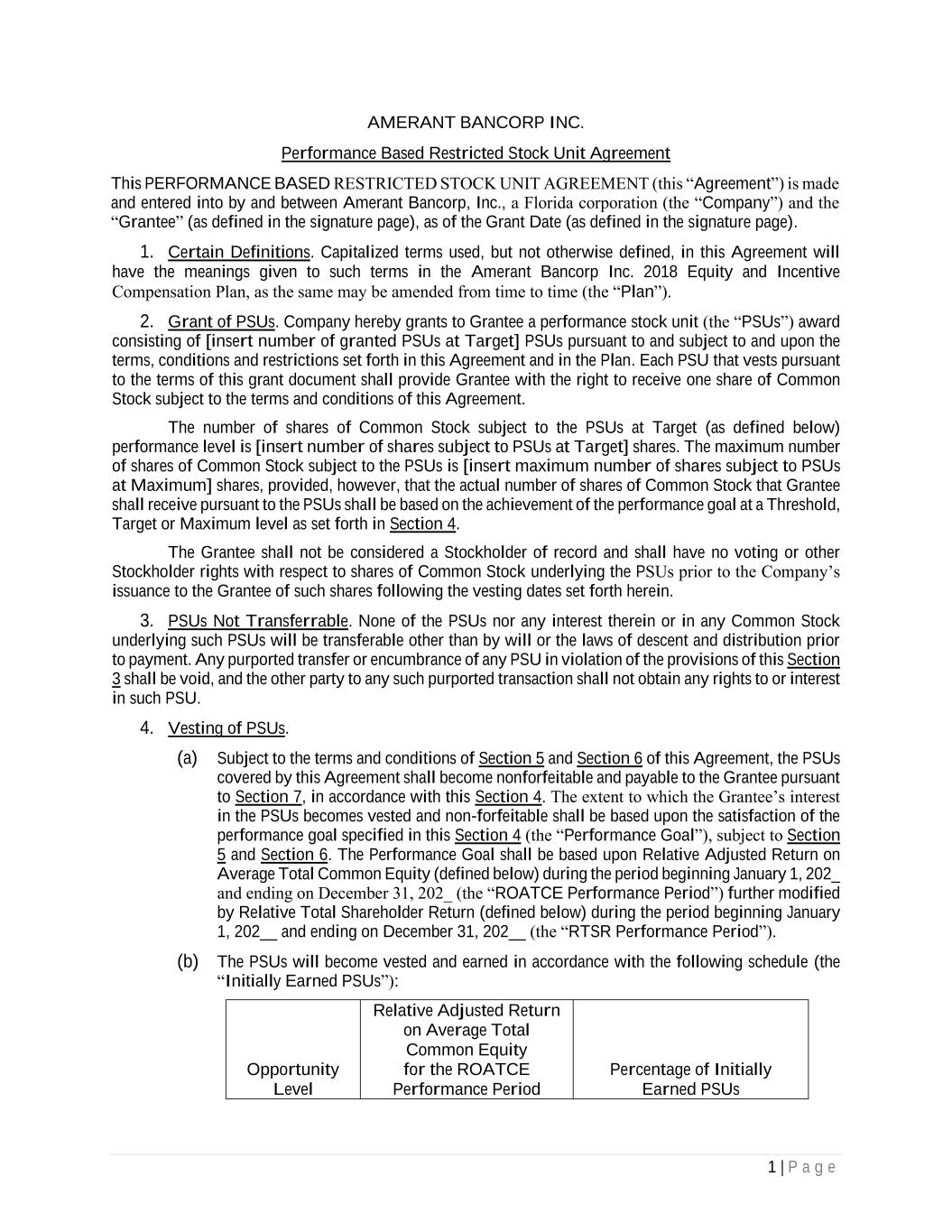 1 | P a g e AMERANT BANCORP INC. Performance Based Restricted Stock Unit Agreement This PERFORMANCE BASED RESTRICTED STOCK UNIT AGREEMENT (this “Agreement”) is made and entered into by and between Amerant Bancorp, Inc., a Florida corporation (the “Company”) and the “Grantee” (as defined in the signature page), as of the Grant Date (as defined in the signature page). 1. Certain Definitions. Capitalized terms used, but not otherwise defined, in this Agreement will have the meanings given to such terms in the Amerant Bancorp Inc. 2018 Equity and Incentive Compensation Plan, as the same may be amended from time to time (the “Plan”). 2. Grant of PSUs. Company hereby grants to Grantee a performance stock unit (the “PSUs”) award consisting of [insert number of granted PSUs at Target] PSUs pursuant to and subject to and upon the terms, conditions and restrictions set forth in this Agreement and in the Plan. Each PSU that vests pursuant to the terms of this grant document shall provide Grantee with the right to receive one share of Common Stock subject to the terms and conditions of this Agreement. The number of shares of Common Stock subject to the PSUs at Target (as defined below) performance level is [insert number of shares subject to PSUs at Target] shares. The maximum number of shares of Common Stock subject to the PSUs is [insert maximum number of shares subject to PSUs at Maximum] shares, provided, however, that the actual number of shares of Common Stock that Grantee shall receive pursuant to the PSUs shall be based on the achievement of the performance goal at a Threshold, Target or Maximum level as set forth in Section 4. The Grantee shall not be considered a Stockholder of record and shall have no voting or other Stockholder rights with respect to shares of Common Stock underlying the PSUs prior to the Company’s issuance to the Grantee of such shares following the vesting dates set forth herein. 3. PSUs Not Transferrable. None of the PSUs nor any interest therein or in any Common Stock underlying such PSUs will be transferable other than by will or the laws of descent and distribution prior to payment. Any purported transfer or encumbrance of any PSU in violation of the provisions of this Section 3 shall be void, and the other party to any such purported transaction shall not obtain any rights to or interest in such PSU. 4. Vesting of PSUs. (a) Subject to the terms and conditions of Section 5 and Section 6 of this Agreement, the PSUs covered by this Agreement shall become nonforfeitable and payable to the Grantee pursuant to Section 7, in accordance with this Section 4. The extent to which the Grantee’s interest in the PSUs becomes vested and non-forfeitable shall be based upon the satisfaction of the performance goal specified in this Section 4 (the “Performance Goal”), subject to Section 5 and Section 6. The Performance Goal shall be based upon Relative Adjusted Return on Average Total Common Equity (defined below) during the period beginning January 1, 202_ and ending on December 31, 202_ (the “ROATCE Performance Period”) further modified by Relative Total Shareholder Return (defined below) during the period beginning January 1, 202__ and ending on December 31, 202__ (the “RTSR Performance Period”). (b) The PSUs will become vested and earned in accordance with the following schedule (the “Initially Earned PSUs”): Opportunity Level Relative Adjusted Return on Average Total Common Equity for the ROATCE Performance Period Percentage of Initially Earned PSUs
