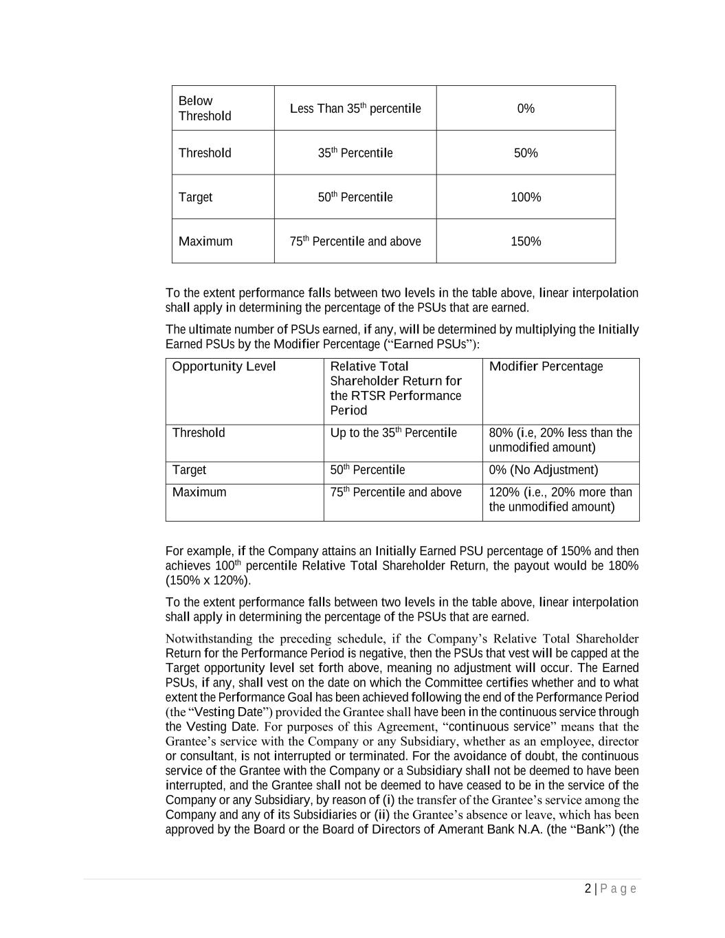 2 | P a g e Below Threshold Less Than 35th percentile 0% Threshold 35th Percentile 50% Target 50th Percentile 100% Maximum 75th Percentile and above 150% To the extent performance falls between two levels in the table above, linear interpolation shall apply in determining the percentage of the PSUs that are earned. The ultimate number of PSUs earned, if any, will be determined by multiplying the Initially Earned PSUs by the Modifier Percentage (“Earned PSUs”): Opportunity Level Relative Total Shareholder Return for the RTSR Performance Period Modifier Percentage Threshold Up to the 35th Percentile 80% (i.e, 20% less than the unmodified amount) Target 50th Percentile 0% (No Adjustment) Maximum 75th Percentile and above 120% (i.e., 20% more than the unmodified amount) For example, if the Company attains an Initially Earned PSU percentage of 150% and then achieves 100th percentile Relative Total Shareholder Return, the payout would be 180% (150% x 120%). To the extent performance falls between two levels in the table above, linear interpolation shall apply in determining the percentage of the PSUs that are earned. Notwithstanding the preceding schedule, if the Company’s Relative Total Shareholder Return for the Performance Period is negative, then the PSUs that vest will be capped at the Target opportunity level set forth above, meaning no adjustment will occur. The Earned PSUs, if any, shall vest on the date on which the Committee certifies whether and to what extent the Performance Goal has been achieved following the end of the Performance Period (the “Vesting Date”) provided the Grantee shall have been in the continuous service through the Vesting Date. For purposes of this Agreement, “continuous service” means that the Grantee’s service with the Company or any Subsidiary, whether as an employee, director or consultant, is not interrupted or terminated. For the avoidance of doubt, the continuous service of the Grantee with the Company or a Subsidiary shall not be deemed to have been interrupted, and the Grantee shall not be deemed to have ceased to be in the service of the Company or any Subsidiary, by reason of (i) the transfer of the Grantee’s service among the Company and any of its Subsidiaries or (ii) the Grantee’s absence or leave, which has been approved by the Board or the Board of Directors of Amerant Bank N.A. (the “Bank”) (the