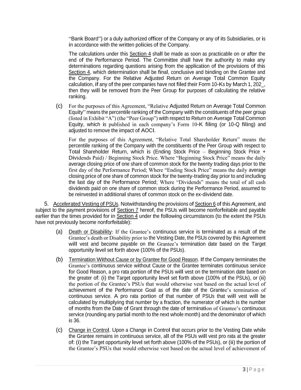 3 | P a g e “Bank Board”) or a duly authorized officer of the Company or any of its Subsidiaries, or is in accordance with the written policies of the Company. The calculations under this Section 4 shall be made as soon as practicable on or after the end of the Performance Period. The Committee shall have the authority to make any determinations regarding questions arising from the application of the provisions of this Section 4, which determination shall be final, conclusive and binding on the Grantee and the Company. For the Relative Adjusted Return on Average Total Common Equity calculation, if any of the peer companies have not filed their Form 10-Ks by March 1, 202_, then they will be removed from the Peer Group for purposes of calculating the relative ranking. (c) For the purposes of this Agreement, “Relative Adjusted Return on Average Total Common Equity” means the percentile ranking of the Company with the constituents of the peer group (listed in Exhibit “A”) (the “Peer Group”) with respect to Return on Average Total Common Equity, which is published in each company’s Form 10-K filing (or 10-Q filing) and adjusted to remove the impact of AOCI. For the purposes of this Agreement, “Relative Total Shareholder Return” means the percentile ranking of the Company with the constituents of the Peer Group with respect to Total Shareholder Return, which is (Ending Stock Price – Beginning Stock Price + Dividends Paid) / Beginning Stock Price. Where “Beginning Stock Price” means the daily average closing price of one share of common stock for the twenty trading days prior to the first day of the Performance Period; Where “Ending Stock Price” means the daily average closing price of one share of common stock for the twenty-trading day prior to and including the last day of the Performance Period; Where “Dividends” means the total of all cash dividends paid on one share of common stock during the Performance Period, assumed to be reinvested in additional shares of common stock on the ex-dividend date. 5. Accelerated Vesting of PSUs. Notwithstanding the provisions of Section 6 of this Agreement, and subject to the payment provisions of Section 7 hereof, the PSUs will become nonforfeitable and payable earlier than the times provided for in Section 4 under the following circumstances (to the extent the PSUs have not previously become nonforfeitable): (a) Death or Disability: If the Grantee’s continuous service is terminated as a result of the Grantee’s death or Disability prior to the Vesting Date, the PSUs covered by this Agreement will vest and become payable on the Grantee’s termination date based on the Target opportunity level set forth above (100% of the PSUs). (b) Termination Without Cause or by Grantee for Good Reason. If the Company terminates the Grantee’s continuous service without Cause or the Grantee terminates continuous service for Good Reason, a pro rata portion of the PSUs will vest on the termination date based on the greater of: (i) the Target opportunity level set forth above (100% of the PSUs), or (ii) the portion of the Grantee’s PSUs that would otherwise vest based on the actual level of achievement of the Performance Goal as of the date of the Grantee’s termination of continuous service. A pro rata portion of that number of PSUs that will vest will be calculated by multiplying that number by a fraction, the numerator of which is the number of months from the Date of Grant through the date of termination of Grantee’s continuous service (rounding any partial month to the next whole month) and the denominator of which is 36. (c) Change in Control. Upon a Change in Control that occurs prior to the Vesting Date while the Grantee remains in continuous service, all of the PSUs will vest pro rata at the greater of: (i) the Target opportunity level set forth above (100% of the PSUs), or (ii) the portion of the Grantee’s PSUs that would otherwise vest based on the actual level of achievement of
