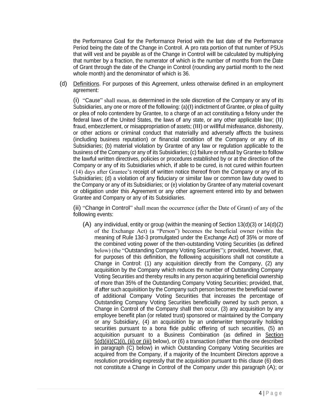 4 | P a g e the Performance Goal for the Performance Period with the last date of the Performance Period being the date of the Change in Control. A pro rata portion of that number of PSUs that will vest and be payable as of the Change in Control will be calculated by multiplying that number by a fraction, the numerator of which is the number of months from the Date of Grant through the date of the Change in Control (rounding any partial month to the next whole month) and the denominator of which is 36. (d) Definitions. For purposes of this Agreement, unless otherwise defined in an employment agreement: (i) “Cause” shall mean, as determined in the sole discretion of the Company or any of its Subsidiaries, any one or more of the following: (a)(I) indictment of Grantee, or plea of guilty or plea of nolo contendere by Grantee, to a charge of an act constituting a felony under the federal laws of the United States, the laws of any state, or any other applicable law; (II) fraud, embezzlement, or misappropriation of assets; (III) or willful misfeasance, dishonesty, or other actions or criminal conduct that materially and adversely affects the business (including business reputation) or financial condition of the Company or any of its Subsidiaries; (b) material violation by Grantee of any law or regulation applicable to the business of the Company or any of its Subsidiaries; (c) failure or refusal by Grantee to follow the lawful written directives, policies or procedures established by or at the direction of the Company or any of its Subsidiaries which, if able to be cured, is not cured within fourteen (14) days after Grantee’s receipt of written notice thereof from the Company or any of its Subsidiaries; (d) a violation of any fiduciary or similar law or common law duty owed to the Company or any of its Subsidiaries; or (e) violation by Grantee of any material covenant or obligation under this Agreement or any other agreement entered into by and between Grantee and Company or any of its Subsidiaries. (ii) “Change in Control” shall mean the occurrence (after the Date of Grant) of any of the following events: (A) any individual, entity or group (within the meaning of Section 13(d)(3) or 14(d)(2) of the Exchange Act) (a “Person”) becomes the beneficial owner (within the meaning of Rule 13d-3 promulgated under the Exchange Act) of 35% or more of the combined voting power of the then-outstanding Voting Securities (as defined below) (the “Outstanding Company Voting Securities”); provided, however, that, for purposes of this definition, the following acquisitions shall not constitute a Change in Control: (1) any acquisition directly from the Company, (2) any acquisition by the Company which reduces the number of Outstanding Company Voting Securities and thereby results in any person acquiring beneficial ownership of more than 35% of the Outstanding Company Voting Securities; provided, that, if after such acquisition by the Company such person becomes the beneficial owner of additional Company Voting Securities that increases the percentage of Outstanding Company Voting Securities beneficially owned by such person, a Change in Control of the Company shall then occur, (3) any acquisition by any employee benefit plan (or related trust) sponsored or maintained by the Company or any Subsidiary, (4) an acquisition by an underwriter temporarily holding securities pursuant to a bona fide public offering of such securities, (5) an acquisition pursuant to a Business Combination (as defined in Section 5(d)(ii)(C)(i), (ii) or (iii) below), or (6) a transaction (other than the one described in paragraph (C) below) in which Outstanding Company Voting Securities are acquired from the Company, if a majority of the Incumbent Directors approve a resolution providing expressly that the acquisition pursuant to this clause (6) does not constitute a Change in Control of the Company under this paragraph (A); or