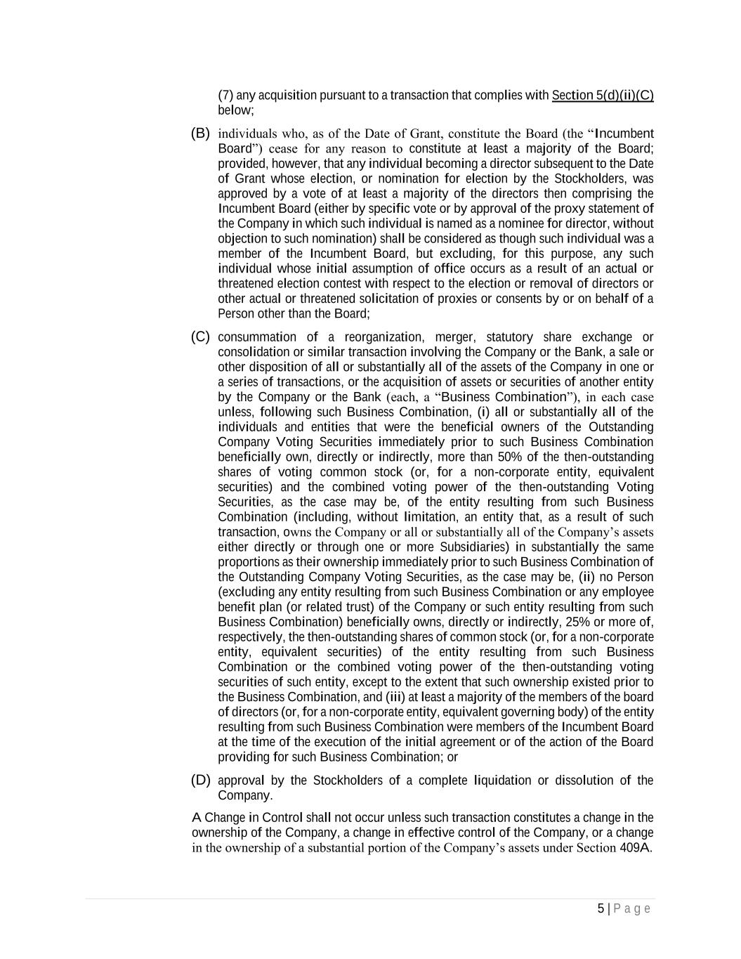 5 | P a g e (7) any acquisition pursuant to a transaction that complies with Section 5(d)(ii)(C) below; (B) individuals who, as of the Date of Grant, constitute the Board (the “Incumbent Board”) cease for any reason to constitute at least a majority of the Board; provided, however, that any individual becoming a director subsequent to the Date of Grant whose election, or nomination for election by the Stockholders, was approved by a vote of at least a majority of the directors then comprising the Incumbent Board (either by specific vote or by approval of the proxy statement of the Company in which such individual is named as a nominee for director, without objection to such nomination) shall be considered as though such individual was a member of the Incumbent Board, but excluding, for this purpose, any such individual whose initial assumption of office occurs as a result of an actual or threatened election contest with respect to the election or removal of directors or other actual or threatened solicitation of proxies or consents by or on behalf of a Person other than the Board; (C) consummation of a reorganization, merger, statutory share exchange or consolidation or similar transaction involving the Company or the Bank, a sale or other disposition of all or substantially all of the assets of the Company in one or a series of transactions, or the acquisition of assets or securities of another entity by the Company or the Bank (each, a “Business Combination”), in each case unless, following such Business Combination, (i) all or substantially all of the individuals and entities that were the beneficial owners of the Outstanding Company Voting Securities immediately prior to such Business Combination beneficially own, directly or indirectly, more than 50% of the then-outstanding shares of voting common stock (or, for a non-corporate entity, equivalent securities) and the combined voting power of the then-outstanding Voting Securities, as the case may be, of the entity resulting from such Business Combination (including, without limitation, an entity that, as a result of such transaction, owns the Company or all or substantially all of the Company’s assets either directly or through one or more Subsidiaries) in substantially the same proportions as their ownership immediately prior to such Business Combination of the Outstanding Company Voting Securities, as the case may be, (ii) no Person (excluding any entity resulting from such Business Combination or any employee benefit plan (or related trust) of the Company or such entity resulting from such Business Combination) beneficially owns, directly or indirectly, 25% or more of, respectively, the then-outstanding shares of common stock (or, for a non-corporate entity, equivalent securities) of the entity resulting from such Business Combination or the combined voting power of the then-outstanding voting securities of such entity, except to the extent that such ownership existed prior to the Business Combination, and (iii) at least a majority of the members of the board of directors (or, for a non-corporate entity, equivalent governing body) of the entity resulting from such Business Combination were members of the Incumbent Board at the time of the execution of the initial agreement or of the action of the Board providing for such Business Combination; or (D) approval by the Stockholders of a complete liquidation or dissolution of the Company. A Change in Control shall not occur unless such transaction constitutes a change in the ownership of the Company, a change in effective control of the Company, or a change in the ownership of a substantial portion of the Company’s assets under Section 409A.