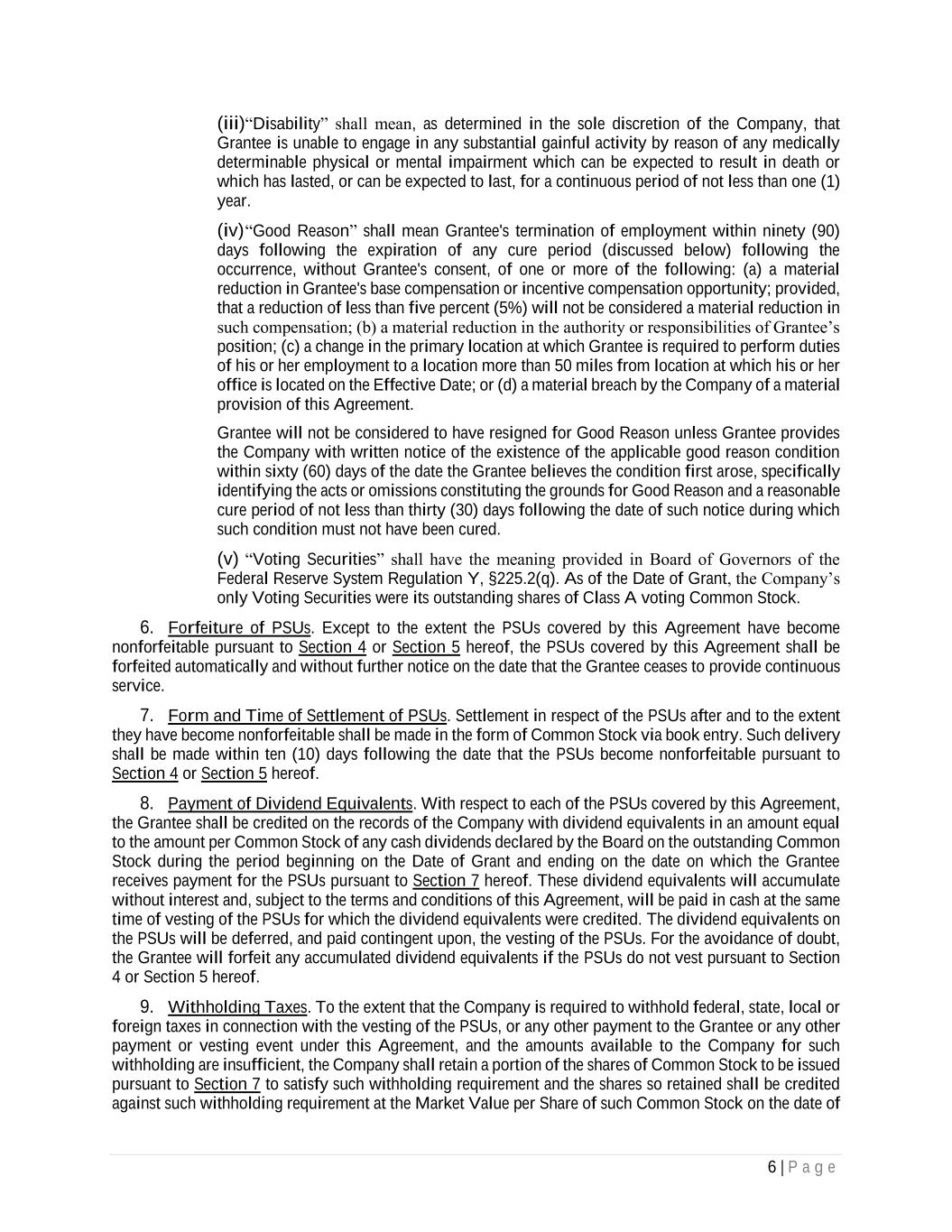 6 | P a g e (iii)“Disability” shall mean, as determined in the sole discretion of the Company, that Grantee is unable to engage in any substantial gainful activity by reason of any medically determinable physical or mental impairment which can be expected to result in death or which has lasted, or can be expected to last, for a continuous period of not less than one (1) year. (iv) “Good Reason” shall mean Grantee's termination of employment within ninety (90) days following the expiration of any cure period (discussed below) following the occurrence, without Grantee's consent, of one or more of the following: (a) a material reduction in Grantee's base compensation or incentive compensation opportunity; provided, that a reduction of less than five percent (5%) will not be considered a material reduction in such compensation; (b) a material reduction in the authority or responsibilities of Grantee’s position; (c) a change in the primary location at which Grantee is required to perform duties of his or her employment to a location more than 50 miles from location at which his or her office is located on the Effective Date; or (d) a material breach by the Company of a material provision of this Agreement. Grantee will not be considered to have resigned for Good Reason unless Grantee provides the Company with written notice of the existence of the applicable good reason condition within sixty (60) days of the date the Grantee believes the condition first arose, specifically identifying the acts or omissions constituting the grounds for Good Reason and a reasonable cure period of not less than thirty (30) days following the date of such notice during which such condition must not have been cured. (v) “Voting Securities” shall have the meaning provided in Board of Governors of the Federal Reserve System Regulation Y, §225.2(q). As of the Date of Grant, the Company’s only Voting Securities were its outstanding shares of Class A voting Common Stock. 6. Forfeiture of PSUs. Except to the extent the PSUs covered by this Agreement have become nonforfeitable pursuant to Section 4 or Section 5 hereof, the PSUs covered by this Agreement shall be forfeited automatically and without further notice on the date that the Grantee ceases to provide continuous service. 7. Form and Time of Settlement of PSUs. Settlement in respect of the PSUs after and to the extent they have become nonforfeitable shall be made in the form of Common Stock via book entry. Such delivery shall be made within ten (10) days following the date that the PSUs become nonforfeitable pursuant to Section 4 or Section 5 hereof. 8. Payment of Dividend Equivalents. With respect to each of the PSUs covered by this Agreement, the Grantee shall be credited on the records of the Company with dividend equivalents in an amount equal to the amount per Common Stock of any cash dividends declared by the Board on the outstanding Common Stock during the period beginning on the Date of Grant and ending on the date on which the Grantee receives payment for the PSUs pursuant to Section 7 hereof. These dividend equivalents will accumulate without interest and, subject to the terms and conditions of this Agreement, will be paid in cash at the same time of vesting of the PSUs for which the dividend equivalents were credited. The dividend equivalents on the PSUs will be deferred, and paid contingent upon, the vesting of the PSUs. For the avoidance of doubt, the Grantee will forfeit any accumulated dividend equivalents if the PSUs do not vest pursuant to Section 4 or Section 5 hereof. 9. Withholding Taxes. To the extent that the Company is required to withhold federal, state, local or foreign taxes in connection with the vesting of the PSUs, or any other payment to the Grantee or any other payment or vesting event under this Agreement, and the amounts available to the Company for such withholding are insufficient, the Company shall retain a portion of the shares of Common Stock to be issued pursuant to Section 7 to satisfy such withholding requirement and the shares so retained shall be credited against such withholding requirement at the Market Value per Share of such Common Stock on the date of