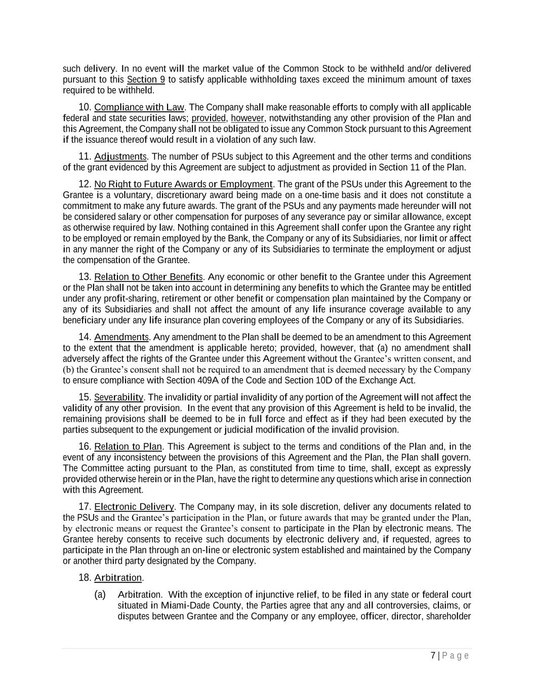 7 | P a g e such delivery. In no event will the market value of the Common Stock to be withheld and/or delivered pursuant to this Section 9 to satisfy applicable withholding taxes exceed the minimum amount of taxes required to be withheld. 10. Compliance with Law. The Company shall make reasonable efforts to comply with all applicable federal and state securities laws; provided, however, notwithstanding any other provision of the Plan and this Agreement, the Company shall not be obligated to issue any Common Stock pursuant to this Agreement if the issuance thereof would result in a violation of any such law. 11. Adjustments. The number of PSUs subject to this Agreement and the other terms and conditions of the grant evidenced by this Agreement are subject to adjustment as provided in Section 11 of the Plan. 12. No Right to Future Awards or Employment. The grant of the PSUs under this Agreement to the Grantee is a voluntary, discretionary award being made on a one-time basis and it does not constitute a commitment to make any future awards. The grant of the PSUs and any payments made hereunder will not be considered salary or other compensation for purposes of any severance pay or similar allowance, except as otherwise required by law. Nothing contained in this Agreement shall confer upon the Grantee any right to be employed or remain employed by the Bank, the Company or any of its Subsidiaries, nor limit or affect in any manner the right of the Company or any of its Subsidiaries to terminate the employment or adjust the compensation of the Grantee. 13. Relation to Other Benefits. Any economic or other benefit to the Grantee under this Agreement or the Plan shall not be taken into account in determining any benefits to which the Grantee may be entitled under any profit-sharing, retirement or other benefit or compensation plan maintained by the Company or any of its Subsidiaries and shall not affect the amount of any life insurance coverage available to any beneficiary under any life insurance plan covering employees of the Company or any of its Subsidiaries. 14. Amendments. Any amendment to the Plan shall be deemed to be an amendment to this Agreement to the extent that the amendment is applicable hereto; provided, however, that (a) no amendment shall adversely affect the rights of the Grantee under this Agreement without the Grantee’s written consent, and (b) the Grantee’s consent shall not be required to an amendment that is deemed necessary by the Company to ensure compliance with Section 409A of the Code and Section 10D of the Exchange Act. 15. Severability. The invalidity or partial invalidity of any portion of the Agreement will not affect the validity of any other provision. In the event that any provision of this Agreement is held to be invalid, the remaining provisions shall be deemed to be in full force and effect as if they had been executed by the parties subsequent to the expungement or judicial modification of the invalid provision. 16. Relation to Plan. This Agreement is subject to the terms and conditions of the Plan and, in the event of any inconsistency between the provisions of this Agreement and the Plan, the Plan shall govern. The Committee acting pursuant to the Plan, as constituted from time to time, shall, except as expressly provided otherwise herein or in the Plan, have the right to determine any questions which arise in connection with this Agreement. 17. Electronic Delivery. The Company may, in its sole discretion, deliver any documents related to the PSUs and the Grantee’s participation in the Plan, or future awards that may be granted under the Plan, by electronic means or request the Grantee’s consent to participate in the Plan by electronic means. The Grantee hereby consents to receive such documents by electronic delivery and, if requested, agrees to participate in the Plan through an on-line or electronic system established and maintained by the Company or another third party designated by the Company. 18. Arbitration. (a) Arbitration. With the exception of injunctive relief, to be filed in any state or federal court situated in Miami-Dade County, the Parties agree that any and all controversies, claims, or disputes between Grantee and the Company or any employee, officer, director, shareholder