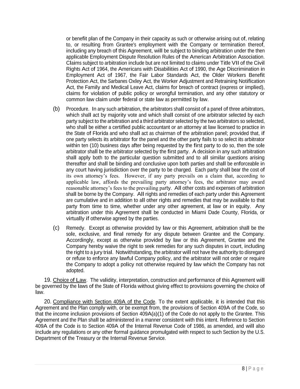 8 | P a g e or benefit plan of the Company in their capacity as such or otherwise arising out of, relating to, or resulting from Grantee's employment with the Company or termination thereof, including any breach of this Agreement, will be subject to binding arbitration under the then applicable Employment Dispute Resolution Rules of the American Arbitration Association. Claims subject to arbitration include but are not limited to claims under Title VII of the Civil Rights Act of 1964, the Americans with Disabilities Act of 1990, the Age Discrimination in Employment Act of 1967, the Fair Labor Standards Act, the Older Workers Benefit Protection Act, the Sarbanes Oxley Act, the Worker Adjustment and Retraining Notification Act, the Family and Medical Leave Act, claims for breach of contract (express or implied), claims for violation of public policy or wrongful termination, and any other statutory or common law claim under federal or state law as permitted by law. (b) Procedure. In any such arbitration, the arbitrators shall consist of a panel of three arbitrators, which shall act by majority vote and which shall consist of one arbitrator selected by each party subject to the arbitration and a third arbitrator selected by the two arbitrators so selected, who shall be either a certified public accountant or an attorney at law licensed to practice in the State of Florida and who shall act as chairman of the arbitration panel; provided that, if one party selects its arbitrator for the panel and the other party fails to so select its arbitrator within ten (10) business days after being requested by the first party to do so, then the sole arbitrator shall be the arbitrator selected by the first party. A decision in any such arbitration shall apply both to the particular question submitted and to all similar questions arising thereafter and shall be binding and conclusive upon both parties and shall be enforceable in any court having jurisdiction over the party to be charged. Each party shall bear the cost of its own attorney’s fees. However, if any party prevails on a claim that, according to applicable law, affords the prevailing party attorney’s fees, the arbitrator may award reasonable attorney’s fees to the prevailing party. All other costs and expenses of arbitration shall be borne by the Company. All rights and remedies of each party under this Agreement are cumulative and in addition to all other rights and remedies that may be available to that party from time to time, whether under any other agreement, at law or in equity. Any arbitration under this Agreement shall be conducted in Miami Dade County, Florida, or virtually if otherwise agreed by the parties. (c) Remedy. Except as otherwise provided by law or this Agreement, arbitration shall be the sole, exclusive, and final remedy for any dispute between Grantee and the Company. Accordingly, except as otherwise provided by law or this Agreement, Grantee and the Company hereby waive the right to seek remedies for any such disputes in court, including the right to a jury trial. Notwithstanding, the arbitrator will not have the authority to disregard or refuse to enforce any lawful Company policy, and the arbitrator will not order or require the Company to adopt a policy not otherwise required by law which the Company has not adopted. 19. Choice of Law. The validity, interpretation, construction and performance of this Agreement will be governed by the laws of the State of Florida without giving effect to provisions governing the choice of law. 20. Compliance with Section 409A of the Code. To the extent applicable, it is intended that this Agreement and the Plan comply with, or be exempt from, the provisions of Section 409A of the Code, so that the income inclusion provisions of Section 409A(a)(1) of the Code do not apply to the Grantee. This Agreement and the Plan shall be administered in a manner consistent with this intent. Reference to Section 409A of the Code is to Section 409A of the Internal Revenue Code of 1986, as amended, and will also include any regulations or any other formal guidance promulgated with respect to such Section by the U.S. Department of the Treasury or the Internal Revenue Service.