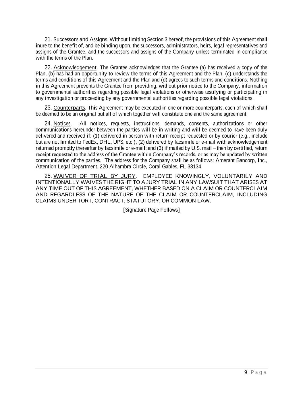 9 | P a g e 21. Successors and Assigns. Without limiting Section 3 hereof, the provisions of this Agreement shall inure to the benefit of, and be binding upon, the successors, administrators, heirs, legal representatives and assigns of the Grantee, and the successors and assigns of the Company unless terminated in compliance with the terms of the Plan. 22. Acknowledgement. The Grantee acknowledges that the Grantee (a) has received a copy of the Plan, (b) has had an opportunity to review the terms of this Agreement and the Plan, (c) understands the terms and conditions of this Agreement and the Plan and (d) agrees to such terms and conditions. Nothing in this Agreement prevents the Grantee from providing, without prior notice to the Company, information to governmental authorities regarding possible legal violations or otherwise testifying or participating in any investigation or proceeding by any governmental authorities regarding possible legal violations. 23. Counterparts. This Agreement may be executed in one or more counterparts, each of which shall be deemed to be an original but all of which together will constitute one and the same agreement. 24. Notices. All notices, requests, instructions, demands, consents, authorizations or other communications hereunder between the parties will be in writing and will be deemed to have been duly delivered and received if: (1) delivered in person with return receipt requested or by courier (e.g., include but are not limited to FedEx, DHL, UPS, etc.); (2) delivered by facsimile or e-mail with acknowledgement returned promptly thereafter by facsimile or e-mail; and (3) if mailed by U.S. mail – then by certified, return receipt requested to the address of the Grantee within Company’s records, or as may be updated by written communication of the parties. The address for the Company shall be as follows: Amerant Bancorp, Inc., Attention Legal Department, 220 Alhambra Circle, Coral Gables, FL 33134. 25. WAIVER OF TRIAL BY JURY. EMPLOYEE KNOWINGLY, VOLUNTARILY AND INTENTIONALLY WAIVES THE RIGHT TO A JURY TRIAL IN ANY LAWSUIT THAT ARISES AT ANY TIME OUT OF THIS AGREEMENT, WHETHER BASED ON A CLAIM OR COUNTERCLAIM AND REGARDLESS OF THE NATURE OF THE CLAIM OR COUNTERCLAIM, INCLUDING CLAIMS UNDER TORT, CONTRACT, STATUTORY, OR COMMON LAW. [Signature Page Follows]