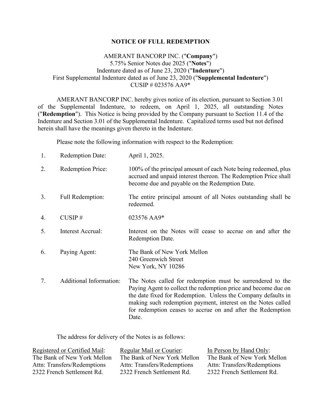 NOTICE OF FULL REDEMPTION AMERANT BANCORP INC. ("Company") 5.75% Senior Notes due 2025 ("Notes") Indenture dated as of June 23, 2020 ("Indenture") First Supplemental Indenture dated as of June 23, 2020 ("Supplemental Indenture") CUSIP # 023576 AA9* AMERANT BANCORP INC. hereby gives notice of its election, pursuant to Section 3.01 of the Supplemental Indenture, to redeem, on April 1, 2025, all outstanding Notes ("Redemption"). This Notice is being provided by the Company pursuant to Section 11.4 of the Indenture and Section 3.01 of the Supplemental Indenture. Capitalized terms used but not defined herein shall have the meanings given thereto in the Indenture. Please note the following information with respect to the Redemption: 1. Redemption Date: April 1, 2025. 2. Redemption Price: 100% of the principal amount of each Note being redeemed, plus accrued and unpaid interest thereon. The Redemption Price shall become due and payable on the Redemption Date. 3. Full Redemption: The entire principal amount of all Notes outstanding shall be redeemed. 4. CUSIP # 023576 AA9* 5. Interest Accrual: Interest on the Notes will cease to accrue on and after the Redemption Date. 6. Paying Agent: The Bank of New York Mellon 240 Greenwich Street New York, NY 10286 7. Additional Information: The Notes called for redemption must be surrendered to the Paying Agent to collect the redemption price and become due on the date fixed for Redemption. Unless the Company defaults in making such redemption payment, interest on the Notes called for redemption ceases to accrue on and after the Redemption Date. The address for delivery of the Notes is as follows: Registered or Certified Mail: The Bank of New York Mellon Attn: Transfers/Redemptions 2322 French Settlement Rd. Regular Mail or Courier: The Bank of New York Mellon Attn: Transfers/Redemptions 2322 French Settlement Rd. In Person by Hand Only: The Bank of New York Mellon Attn: Transfers/Redemptions 2322 French Settlement Rd.