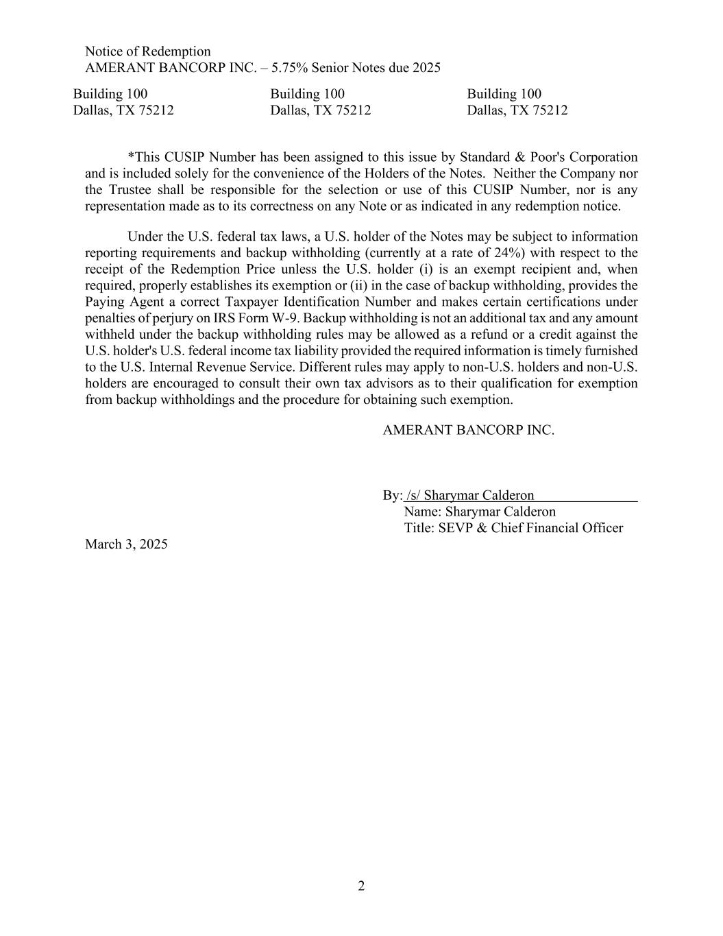 Notice of Redemption AMERANT BANCORP INC. – 5.75% Senior Notes due 2025 2 Building 100 Dallas, TX 75212 Building 100 Dallas, TX 75212 Building 100 Dallas, TX 75212 *This CUSIP Number has been assigned to this issue by Standard & Poor's Corporation and is included solely for the convenience of the Holders of the Notes. Neither the Company nor the Trustee shall be responsible for the selection or use of this CUSIP Number, nor is any representation made as to its correctness on any Note or as indicated in any redemption notice. Under the U.S. federal tax laws, a U.S. holder of the Notes may be subject to information reporting requirements and backup withholding (currently at a rate of 24%) with respect to the receipt of the Redemption Price unless the U.S. holder (i) is an exempt recipient and, when required, properly establishes its exemption or (ii) in the case of backup withholding, provides the Paying Agent a correct Taxpayer Identification Number and makes certain certifications under penalties of perjury on IRS Form W-9. Backup withholding is not an additional tax and any amount withheld under the backup withholding rules may be allowed as a refund or a credit against the U.S. holder's U.S. federal income tax liability provided the required information is timely furnished to the U.S. Internal Revenue Service. Different rules may apply to non-U.S. holders and non-U.S. holders are encouraged to consult their own tax advisors as to their qualification for exemption from backup withholdings and the procedure for obtaining such exemption. AMERANT BANCORP INC. By: /s/ Sharymar Calderon Name: Sharymar Calderon Title: SEVP & Chief Financial Officer March 3, 2025