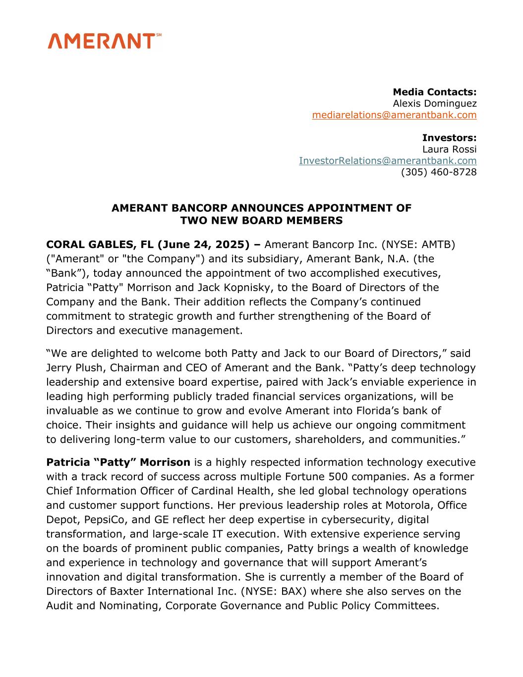 Media Contacts: Alexis Dominguez mediarelations@amerantbank.com Investors: Laura Rossi InvestorRelations@amerantbank.com (305) 460-8728 AMERANT BANCORP ANNOUNCES APPOINTMENT OF TWO NEW BOARD MEMBERS CORAL GABLES, FL (June 24, 2025) – Amerant Bancorp Inc. (NYSE: AMTB) ("Amerant" or "the Company") and its subsidiary, Amerant Bank, N.A. (the “Bank”), today announced the appointment of two accomplished executives, Patricia “Patty" Morrison and Jack Kopnisky, to the Board of Directors of the Company and the Bank. Their addition reflects the Company’s continued commitment to strategic growth and further strengthening of the Board of Directors and executive management. “We are delighted to welcome both Patty and Jack to our Board of Directors,” said Jerry Plush, Chairman and CEO of Amerant and the Bank. “Patty’s deep technology leadership and extensive board expertise, paired with Jack’s enviable experience in leading high performing publicly traded financial services organizations, will be invaluable as we continue to grow and evolve Amerant into Florida’s bank of choice. Their insights and guidance will help us achieve our ongoing commitment to delivering long-term value to our customers, shareholders, and communities.” Patricia “Patty” Morrison is a highly respected information technology executive with a track record of success across multiple Fortune 500 companies. As a former Chief Information Officer of Cardinal Health, she led global technology operations and customer support functions. Her previous leadership roles at Motorola, Office Depot, PepsiCo, and GE reflect her deep expertise in cybersecurity, digital transformation, and large-scale IT execution. With extensive experience serving on the boards of prominent public companies, Patty brings a wealth of knowledge and experience in technology and governance that will support Amerant’s innovation and digital transformation. She is currently a member of the Board of Directors of Baxter International Inc. (NYSE: BAX) where she also serves on the Audit and Nominating, Corporate Governance and Public Policy Committees.