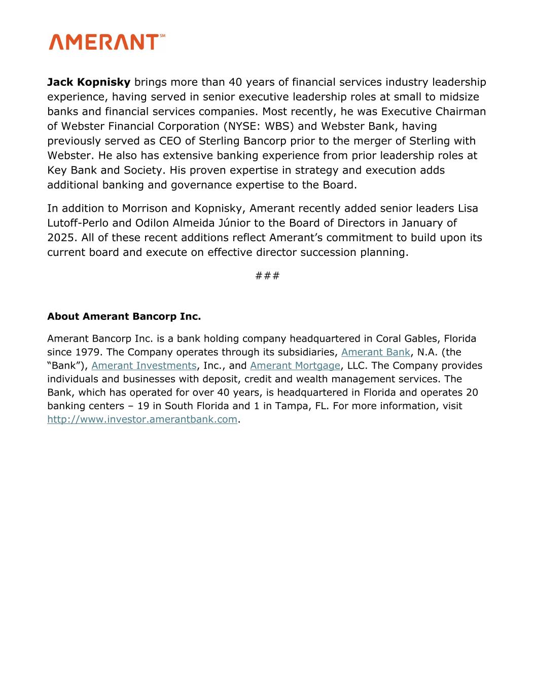 Jack Kopnisky brings more than 40 years of financial services industry leadership experience, having served in senior executive leadership roles at small to midsize banks and financial services companies. Most recently, he was Executive Chairman of Webster Financial Corporation (NYSE: WBS) and Webster Bank, having previously served as CEO of Sterling Bancorp prior to the merger of Sterling with Webster. He also has extensive banking experience from prior leadership roles at Key Bank and Society. His proven expertise in strategy and execution adds additional banking and governance expertise to the Board. In addition to Morrison and Kopnisky, Amerant recently added senior leaders Lisa Lutoff-Perlo and Odilon Almeida Júnior to the Board of Directors in January of 2025. All of these recent additions reflect Amerant’s commitment to build upon its current board and execute on effective director succession planning. ### About Amerant Bancorp Inc. Amerant Bancorp Inc. is a bank holding company headquartered in Coral Gables, Florida since 1979. The Company operates through its subsidiaries, Amerant Bank, N.A. (the “Bank”), Amerant Investments, Inc., and Amerant Mortgage, LLC. The Company provides individuals and businesses with deposit, credit and wealth management services. The Bank, which has operated for over 40 years, is headquartered in Florida and operates 20 banking centers – 19 in South Florida and 1 in Tampa, FL. For more information, visit http://www.investor.amerantbank.com.