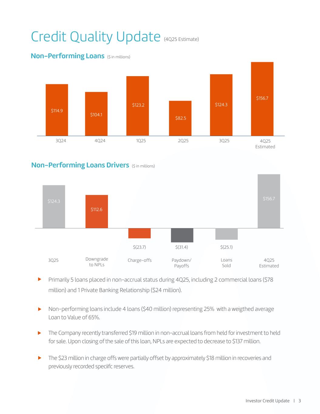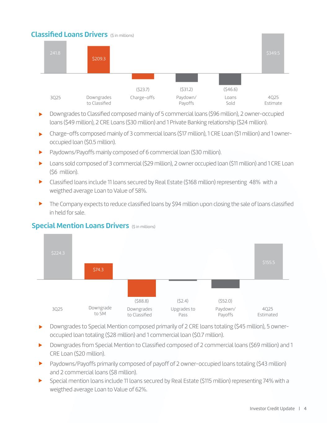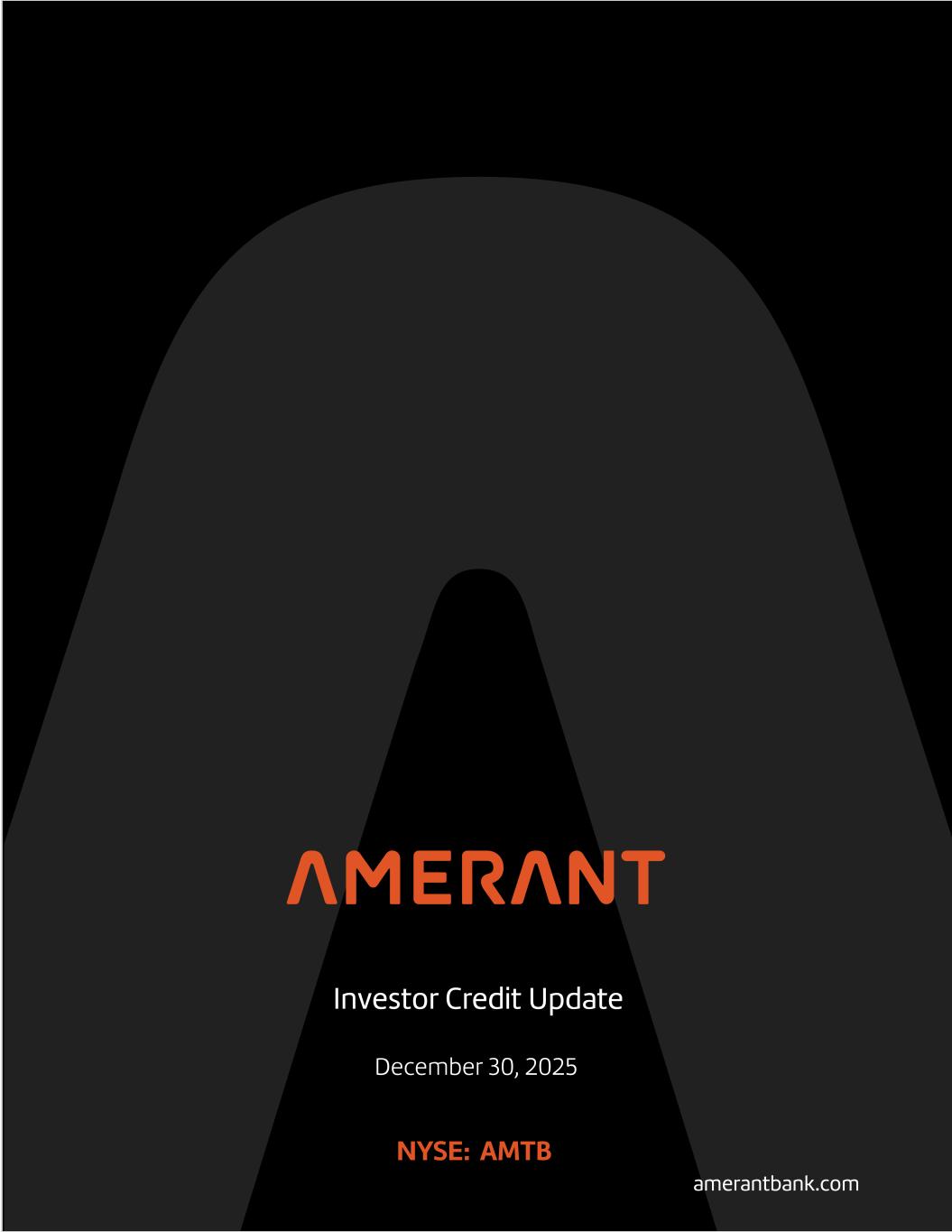 Focus on updating credit risk migration, reducing non-performing assets, and allocating additional resources to accelerate resolution Credit Administration and business lines proactively addressed covenant testing and financial statement updates across the loan portfolio. Additional resources were deployed to expedite these reviews, and resulting risk rating updates were incorporated as part of this process. Weekly all-hands leadership meetings were launched to focus on special assets through a dedicated working group, ensuring continuos oversight, streamlined coordination, and progress tracking. Credit Review expanded portfolio coverage by engaging a well-recognized third-party firm to accelerate risk rating testing and validation efforts during 3Q and 4Q. The Special Assets group actively pursued resolutions of criticized credits, including loan sales, while also increasing focus on collections from previously charged-off loans and recovery Investor Credit Update | 2 Credit Quality remains a core priority for Amerant, and this Credit Update underscores our commitment to providing investors with timely insight into our risk profile ahead of year-end. During 4Q25, we intensified efforts to reinforce credit discipline. The actions detailed below reflect close collaboration between our Credit and Business teams to accelerate portfolio reviews and address non-performing assets. These initiatives demonstrate our dedication to strengthening credit risk management and establishing a solid foundation that we expect will result in sustainable, healthy growth. Loan Portfolio Coverage Analysis – Results During 2025, Credit Administration and Credit Review (in-house and third-party) assessed the adequacy of risk ratings for a significant portion of the loan portfolio, achieving a combined review coverage of approximately 85% of commercial and Commercial Real Estate (CRE) loans. Credit Administration reviewed approximately $4.5 billion or 73% of the commercial and CRE loan portfolio commitments through financial statement reviews and covenant testing during 4Q25. Credit Review completed reviews covering $5.3 billion or 85% of the commercial and CRE loan portfolio commitments. The remaining $1.1 billion, representing 18% of total commercial and CRE loans are broken down as follows: Criticized Portfolio Management – Results The Company transferred approximately $94 million from loans held for investment to loans held for sale. This transfer resulted in a non-routine loss of approximately $16 million, inclusive of estimated transaction costs. The Company expects to enter into agreements for the sale of these loans and to close the transactions in January 2026, which will result in a $94 million reduction of classified loans. - $540 million (896 loans) are below $3 million and are being monitored through payment performance. - $351 million (133 loans) were originated during 2025. - $239 million (18 loans) are above $3 million. $70 million are cash or securities secured and $131 million are secured by Real Estate. (1) (1) “Classified loans” describe loans that are substandard and doubtful. We have no loans categorized as doubtful as of the date of this update.