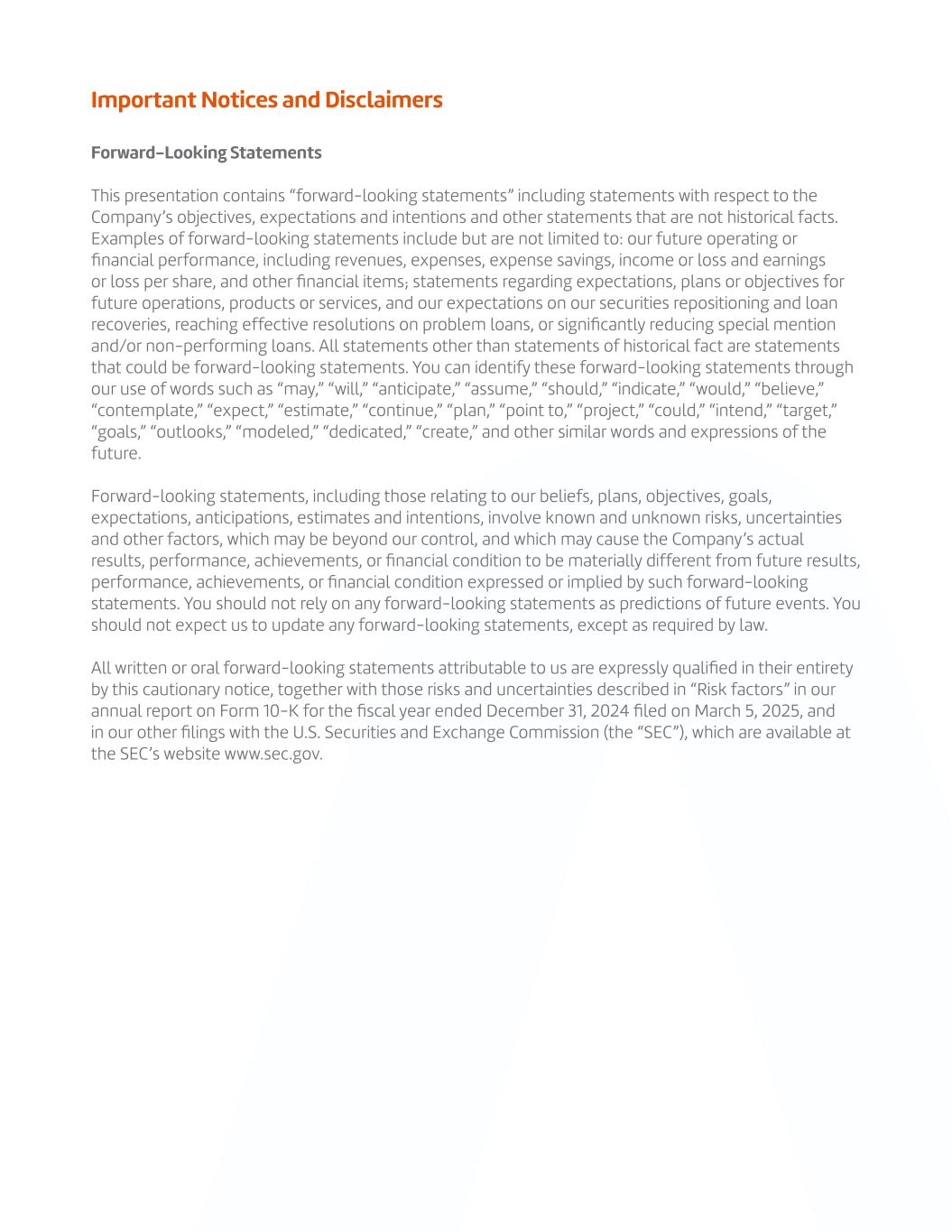 Important Notices and Disclaimers Forward-Looking Statements This presentation contains “forward-looking statements” including statements with respect to the Company’s objectives, expectations and intentions and other statements that are not historical facts. Examples of forward-looking statements include but are not limited to: our future operating or financial performance, including revenues, expenses, expense savings, income or loss and earnings or loss per share, and other financial items; statements regarding expectations, plans or objectives for future operations, products or services, and our expectations on our securities repositioning and loan recoveries, reaching effective resolutions on problem loans, or significantly reducing special mention and/or non-performing loans. All statements other than statements of historical fact are statements that could be forward-looking statements. You can identify these forward-looking statements through our use of words such as “may,” “will,” “anticipate,” “assume,” “should,” “indicate,” “would,” “believe,” “contemplate,” “expect,” “estimate,” “continue,” “plan,” “point to,” “project,” “could,” “intend,” “target,” “goals,” “outlooks,” “modeled,” “dedicated,” “create,” and other similar words and expressions of the future. Forward-looking statements, including those relating to our beliefs, plans, objectives, goals, expectations, anticipations, estimates and intentions, involve known and unknown risks, uncertainties and other factors, which may be beyond our control, and which may cause the Company’s actual results, performance, achievements, or financial condition to be materially different from future results, performance, achievements, or financial condition expressed or implied by such forward-looking statements. You should not rely on any forward-looking statements as predictions of future events. You should not expect us to update any forward-looking statements, except as required by law. All written or oral forward-looking statements attributable to us are expressly qualified in their entirety by this cautionary notice, together with those risks and uncertainties described in “Risk factors” in our annual report on Form 10-K for the fiscal year ended December 31, 2024 filed on March 5, 2025, and in our other filings with the U.S. Securities and Exchange Commission (the “SEC”), which are available at the SEC’s website www.sec.gov.