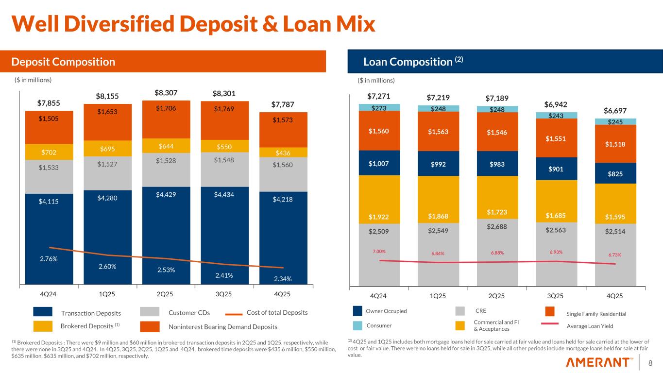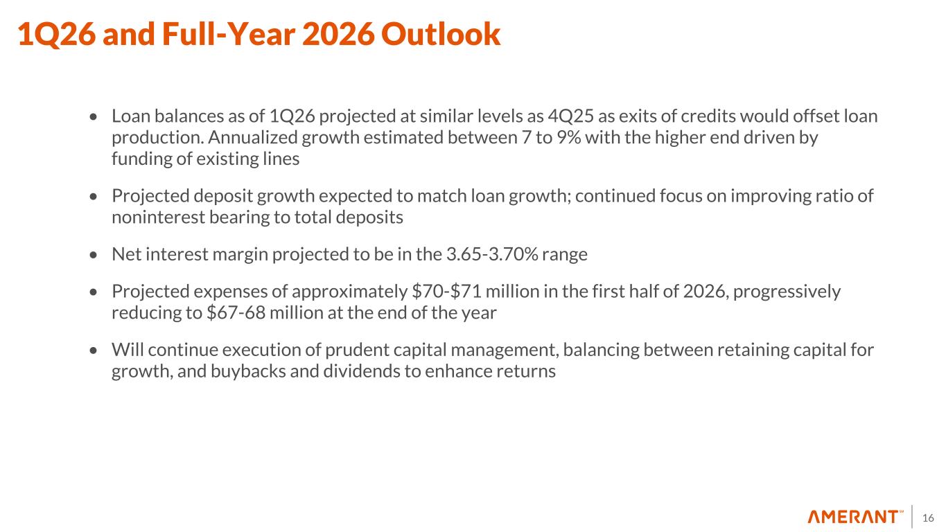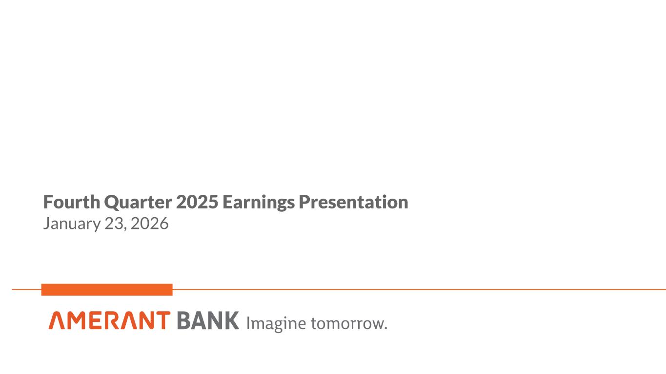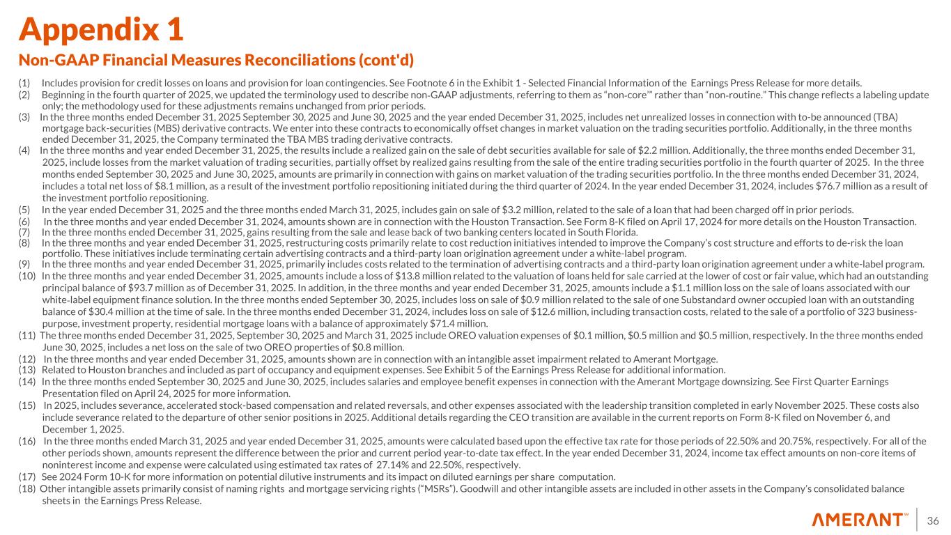 36 Appendix 1 Non-GAAP Financial Measures Reconciliations (cont'd) (1) Includes provision for credit losses on loans and provision for loan contingencies. See Footnote 6 in the Exhibit 1 - Selected Financial Information of the Earnings Press Release for more details. (2) Beginning in the fourth quarter of 2025, we updated the terminology used to describe non-GAAP adjustments, referring to them as “non-core’” rather than “non-routine.” This change reflects a labeling update only; the methodology used for these adjustments remains unchanged from prior periods. (3) In the three months ended December 31, 2025 September 30, 2025 and June 30, 2025 and the year ended December 31, 2025, includes net unrealized losses in connection with to-be announced (TBA) mortgage back-securities (MBS) derivative contracts. We enter into these contracts to economically offset changes in market valuation on the trading securities portfolio. Additionally, in the three months ended December 31, 2025, the Company terminated the TBA MBS trading derivative contracts. (4) In the three months and year ended December 31, 2025, the results include a realized gain on the sale of debt securities available for sale of $2.2 million. Additionally, the three months ended December 31, 2025, include losses from the market valuation of trading securities, partially offset by realized gains resulting from the sale of the entire trading securities portfolio in the fourth quarter of 2025. In the three months ended September 30, 2025 and June 30, 2025, amounts are primarily in connection with gains on market valuation of the trading securities portfolio. In the three months ended December 31, 2024, includes a total net loss of $8.1 million, as a result of the investment portfolio repositioning initiated during the third quarter of 2024. In the year ended December 31, 2024, includes $76.7 million as a result of the investment portfolio repositioning. (5) In the year ended December 31, 2025 and the three months ended March 31, 2025, includes gain on sale of $3.2 million, related to the sale of a loan that had been charged off in prior periods. (6) In the three months and year ended December 31, 2024, amounts shown are in connection with the Houston Transaction. See Form 8-K filed on April 17, 2024 for more details on the Houston Transaction. (7) In the three months ended December 31, 2025, gains resulting from the sale and lease back of two banking centers located in South Florida. (8) In the three months and year ended December 31, 2025, restructuring costs primarily relate to cost reduction initiatives intended to improve the Company’s cost structure and efforts to de-risk the loan portfolio. These initiatives include terminating certain advertising contracts and a third-party loan origination agreement under a white-label program. (9) In the three months and year ended December 31, 2025, primarily includes costs related to the termination of advertising contracts and a third-party loan origination agreement under a white-label program. (10) In the three months and year ended December 31, 2025, amounts include a loss of $13.8 million related to the valuation of loans held for sale carried at the lower of cost or fair value, which had an outstanding principal balance of $93.7 million as of December 31, 2025. In addition, in the three months and year ended December 31, 2025, amounts include a $1.1 million loss on the sale of loans associated with our white-label equipment finance solution. In the three months ended September 30, 2025, includes loss on sale of $0.9 million related to the sale of one Substandard owner occupied loan with an outstanding balance of $30.4 million at the time of sale. In the three months ended December 31, 2024, includes loss on sale of $12.6 million, including transaction costs, related to the sale of a portfolio of 323 business- purpose, investment property, residential mortgage loans with a balance of approximately $71.4 million. (11) The three months ended December 31, 2025, September 30, 2025 and March 31, 2025 include OREO valuation expenses of $0.1 million, $0.5 million and $0.5 million, respectively. In the three months ended June 30, 2025, includes a net loss on the sale of two OREO properties of $0.8 million. (12) In the three months and year ended December 31, 2025, amounts shown are in connection with an intangible asset impairment related to Amerant Mortgage. (13) Related to Houston branches and included as part of occupancy and equipment expenses. See Exhibit 5 of the Earnings Press Release for additional information. (14) In the three months ended September 30, 2025 and June 30, 2025, includes salaries and employee benefit expenses in connection with the Amerant Mortgage downsizing. See First Quarter Earnings Presentation filed on April 24, 2025 for more information. (15) In 2025, includes severance, accelerated stock-based compensation and related reversals, and other expenses associated with the leadership transition completed in early November 2025. These costs also include severance related to the departure of other senior positions in 2025. Additional details regarding the CEO transition are available in the current reports on Form 8-K filed on November 6, and December 1, 2025. (16) In the three months ended March 31, 2025 and year ended December 31, 2025, amounts were calculated based upon the effective tax rate for those periods of 22.50% and 20.75%, respectively. For all of the other periods shown, amounts represent the difference between the prior and current period year-to-date tax effect. In the year ended December 31, 2024, income tax effect amounts on non-core items of noninterest income and expense were calculated using estimated tax rates of 27.14% and 22.50%, respectively. (17) See 2024 Form 10-K for more information on potential dilutive instruments and its impact on diluted earnings per share computation. (18) Other intangible assets primarily consist of naming ri