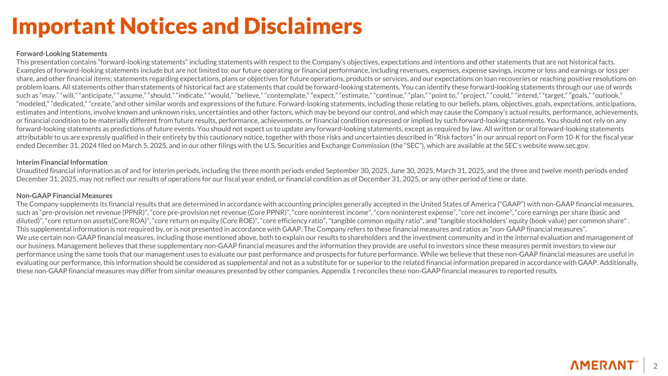 2 Important Notices and Disclaimers Forward-Looking Statements This presentation contains “forward-looking statements” including statements with respect to the Company’s objectives, expectations and intentions and other statements that are not historical facts. Examples of forward-looking statements include but are not limited to: our future operating or financial performance, including revenues, expenses, expense savings, income or loss and earnings or loss per share, and other financial items; statements regarding expectations, plans or objectives for future operations, products or services, and our expectations on loan recoveries or reaching positive resolutions on problem loans. All statements other than statements of historical fact are statements that could be forward-looking statements. You can identify these forward-looking statements through our use of words such as “may,” “will,” “anticipate,” “assume,” “should,” “indicate,” “would,” “believe,” “contemplate,” “expect,” “estimate,” “continue,” “plan,” “point to,” “project,” “could,” “intend,” “target,” “goals,” “outlook,” “modeled,” “dedicated,” “create,”and other similar words and expressions of the future. Forward-looking statements, including those relating to our beliefs, plans, objectives, goals, expectations, anticipations, estimates and intentions, involve known and unknown risks, uncertainties and other factors, which may be beyond our control, and which may cause the Company’s actual results, performance, achievements, or financial condition to be materially different from future results, performance, achievements, or financial condition expressed or implied by such forward-looking statements. You should not rely on any forward-looking statements as predictions of future events. You should not expect us to update any forward-looking statements, except as required by law. All written or oral forward-looking statements attributable to us are expressly qualified in their entirety by this cautionary notice, together with those risks and uncertainties described in “Risk factors” in our annual report on Form 10-K for the fiscal year ended December 31, 2024 filed on March 5, 2025, and in our other filings with the U.S. Securities and Exchange Commission (the “SEC”), which are available at the SEC’s website www.sec.gov. Interim Financial Information Unaudited financial information as of and for interim periods, including the three month periods ended September 30, 2025, June 30, 2025, March 31, 2025, and the three and twelve month periods ended December 31, 2025, may not reflect our results of operations for our fiscal year ended, or financial condition as of December 31, 2025, or any other period of time or date. Non-GAAP Financial Measures The Company supplements its financial results that are determined in accordance with accounting principles generally accepted in the United States of America (“GAAP”) with non-GAAP financial measures, such as “pre-provision net revenue (PPNR)”, “core pre-provision net revenue (Core PPNR)”, “core noninterest income”, “core noninterest expense”, “core net income”, “core earnings per share (basic and diluted)”, “core return on assets(Core ROA)”, “core return on equity (Core ROE)”, “core efficiency ratio”, "tangible common equity ratio", and “tangible stockholders’ equity (book value) per common share" . This supplemental information is not required by, or is not presented in accordance with GAAP. The Company refers to these financial measures and ratios as “non-GAAP financial measures”. We use certain non-GAAP financial measures, including those mentioned above, both to explain our results to shareholders and the investment community and in the internal evaluation and management of our business. Management believes that these supplementary non-GAAP financial measures and the information they provide are useful to investors since these measures permit investors to view our performance using the same tools that our management uses to evaluate our past performance and prospects for future performance. While we believe that these non-GAAP financial measures are useful in evaluating our performance, this information should be considered as supplemental and not as a substitute for or superior to the related financial information prepared in accordance with GAAP. Additionally, these non-GAAP financial measures may differ from similar measures presented by other companies. Appendix 1 reconciles these non-GAAP financial measures to reported results.