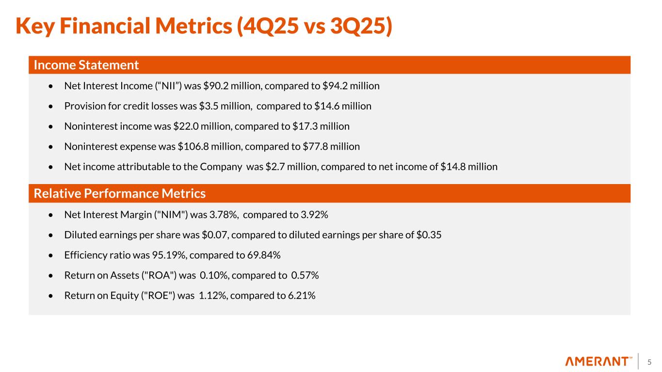 5 Key Financial Metrics (4Q25 vs 3Q25) Income Statement • Net Interest Income (“NII”) was $90.2 million, compared to $94.2 million • Provision for credit losses was $3.5 million, compared to $14.6 million • Noninterest income was $22.0 million, compared to $17.3 million • Noninterest expense was $106.8 million, compared to $77.8 million • Net income attributable to the Company was $2.7 million, compared to net income of $14.8 million Relative Performance Metrics • Net Interest Margin ("NIM") was 3.78%, compared to 3.92% • Diluted earnings per share was $0.07, compared to diluted earnings per share of $0.35 • Efficiency ratio was 95.19%, compared to 69.84% • Return on Assets ("ROA") was 0.10%, compared to 0.57% • Return on Equity ("ROE") was 1.12%, compared to 6.21%