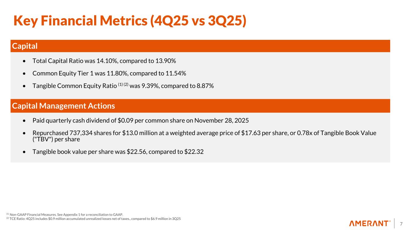 6 Key Financial Metrics (4Q25 vs 3Q25) Non-GAAP Metrics (1) • Core noninterest income was $16.7 million, compared to $17.5 million • Core noninterest expense was $77.6 million, compared to $75.9 million • Pre-provision net revenue ("PPNR") was $5.4 million, compared to $33.6 million • Core PPNR was $29.3 million, compared to $35.8 million • Core Efficiency Ratio was 72.58% compared to 67.96% • Core ROA was 0.84% compared to 0.64% • Core ROE was 8.98% compared to 6.91% Non-Core Items • Noninterest expense was $29.2 million, compared to $2.0 million • Noninterest income was $5.3 million, compared to negative $0.2 million (1) Non-GAAP Financial Measure. See Appendix 1 for a reconciliation to GAAP.