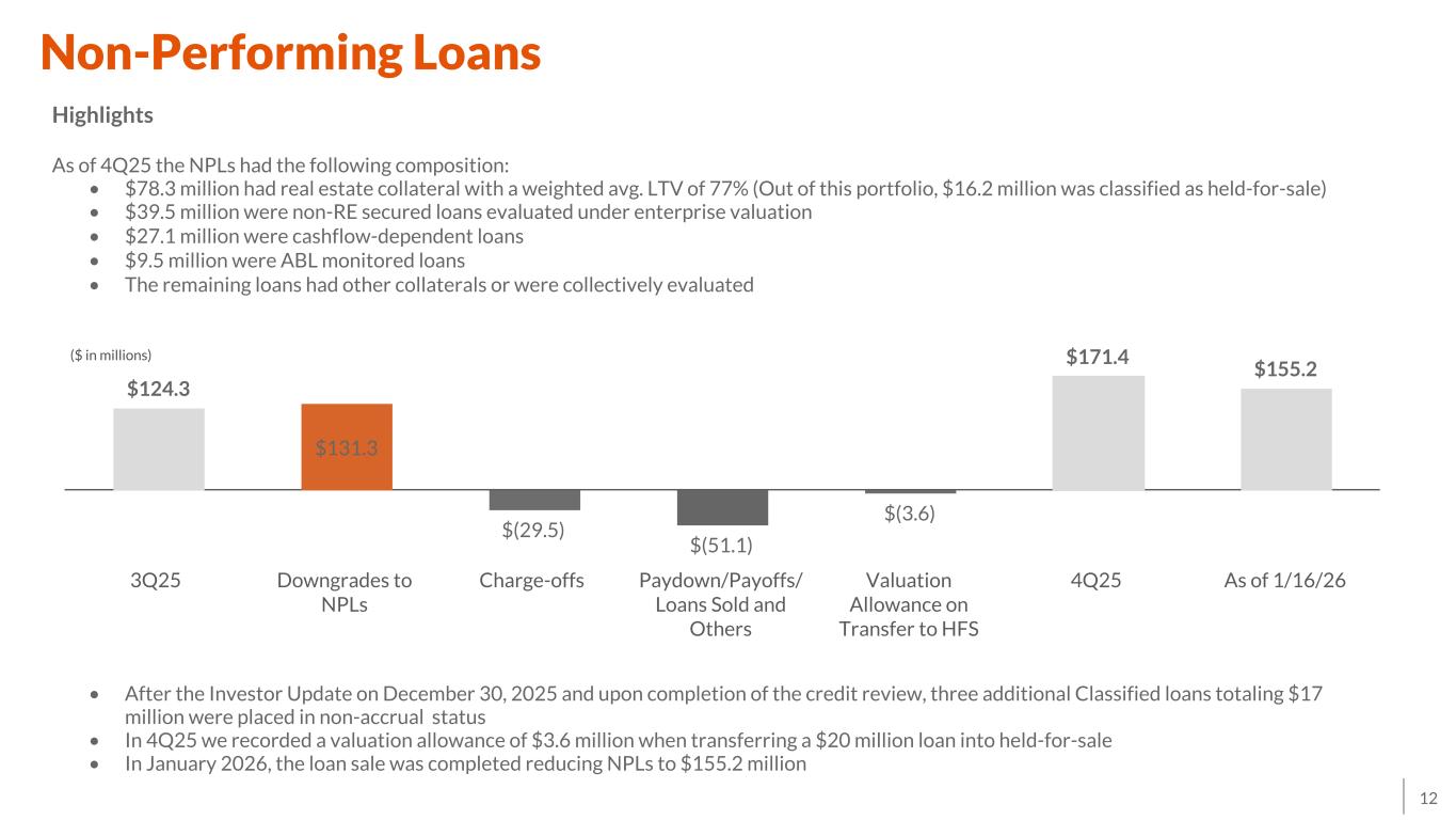 11 Non-Performing Assets $104.1 $123.2 $82.5 $124.3 $171.4 $18.1 $17.5 $15.4 $15.6 $15.5 1.23% 1.38% 0.95% 1.34% 1.91% Non-performing loans OREO NPAs/Total Assets 4Q24 1Q25 2Q25 3Q25 4Q25 ($ in millions except for %) $31.0 $20.5$9.3 $15.9 $8.8 $26.1 $24.0 $22.2 $21.0 $15.3 $29.5 $66.7 $85.1 $52.3 $68.5 $86.1 $0.7 $0.7 $9.2 CRE Single-family Residential Owner Occupied Commercial Consumer loans and overdrafts 4Q24 1Q25 2Q25 3Q25 4Q25 $4.1 Non-Performing Assets Non-Performing Loans Composition ($ in millions) $0.1$4.1 $7.4