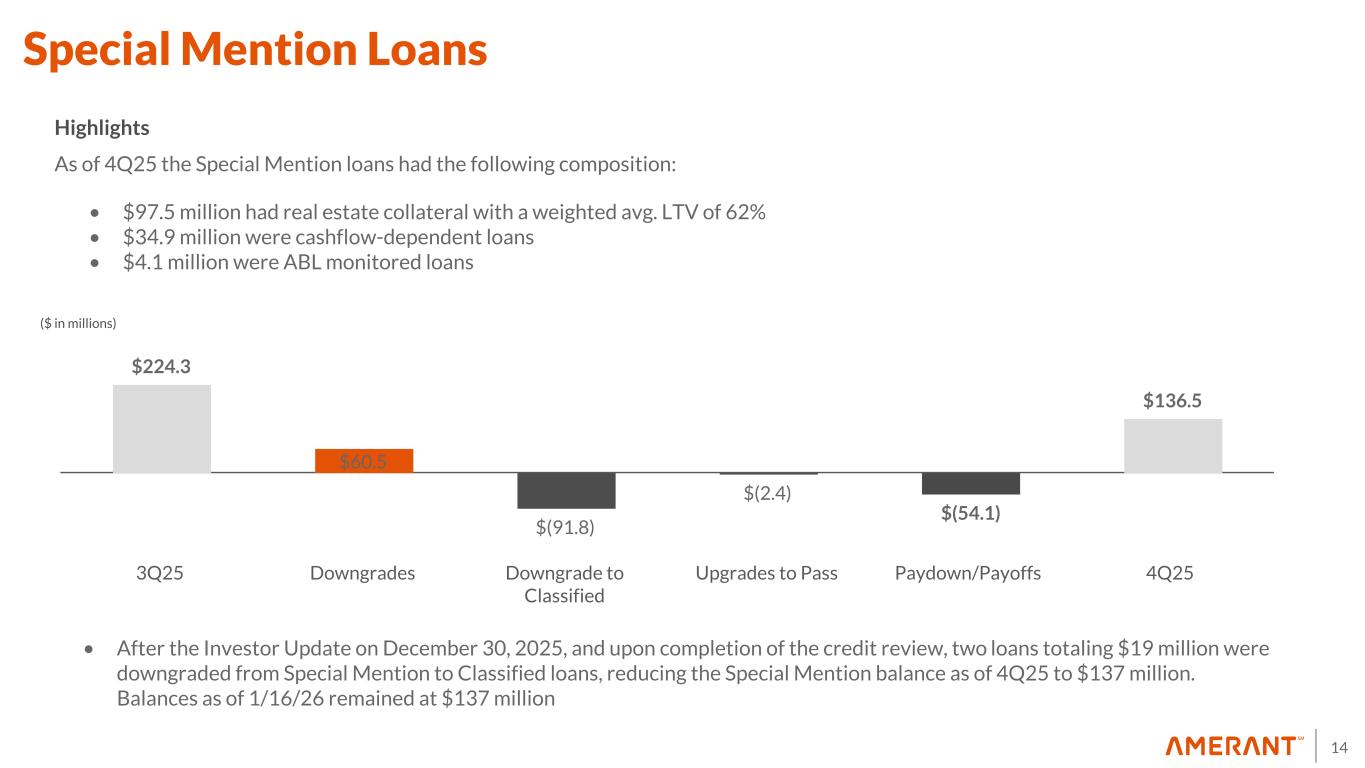13 Classified Loans $241.8 $229.7 $(29.5) $(73.4) $(13.8) $354.8 $273.9 3Q25 Downgrades Charge-offs Paydowns/Payoffs/ Loans Sold Valuation Allowance on Transfer to HFS 4Q25 As of 1/16/26 ($ in millions) Highlights As of 4Q25 the Classified loans had the following composition: • $218.8 million had real estate collateral with a weighted avg. LTV of 69% (Out of this portfolio, $80.9 million were classified as held-for-sale) • $58.1 million were non-RE secured loans evaluated under enterprise valuation • $28.7 million were ABL monitored loans • $29.9 million were cashflow-dependent loans • The remaining loans had other collaterals or were collectively evaluated • After the Investor Update on December 30, 2025 and upon completion of the credit review, two additional loans totaling $19 million were downgraded from Special Mention to Classified loans • In 4Q25 we recorded a valuation allowance of $13.8 million when transferring five loans totaling $94 million into held-for-sale • In January 2026, four loan sales closed totaling $65.7 million. We continue to work on the exit of the remaining $15.2 million credit, which is expected to occur in 1Q26. Classified loans net of HFS closed at $274 million