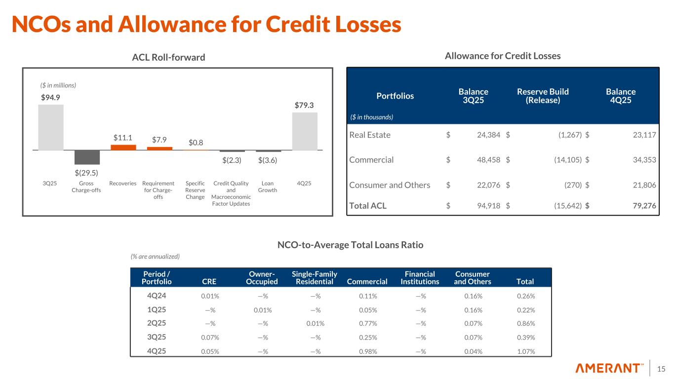14 Special Mention Loans $224.3 $60.5 $(91.8) $(2.4) $(54.1) $136.5 3Q25 Downgrades Downgrade to Classified Upgrades to Pass Paydown/Payoffs 4Q25 ($ in millions) • After the Investor Update on December 30, 2025, and upon completion of the credit review, two loans totaling $19 million were downgraded from Special Mention to Classified loans, reducing the Special Mention balance as of 4Q25 to $137 million. Balances as of 1/16/26 remained at $137 million Highlights As of 4Q25 the Special Mention loans had the following composition: • $97.5 million had real estate collateral with a weighted avg. LTV of 62% • $34.9 million were cashflow-dependent loans • $4.1 million were ABL monitored loans