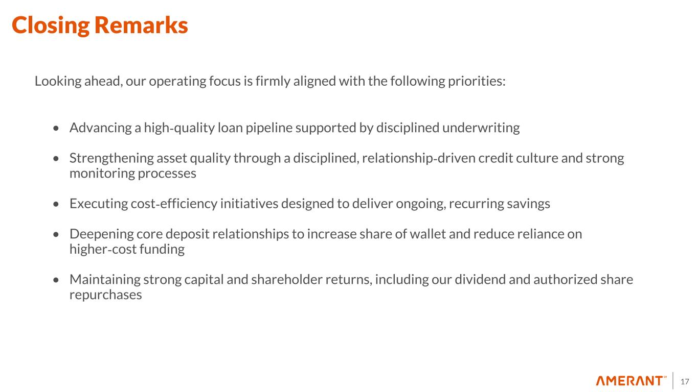 17 Looking ahead, our operating focus is firmly aligned with the following priorities: • Advancing a high-quality loan pipeline supported by disciplined underwriting • Strengthening asset quality through a disciplined, relationship-driven credit culture and strong monitoring processes • Executing cost-efficiency initiatives designed to deliver ongoing, recurring savings • Deepening core deposit relationships to increase share of wallet and reduce reliance on higher-cost funding • Maintaining strong capital and shareholder returns, including our dividend and authorized share repurchases Closing Remarks