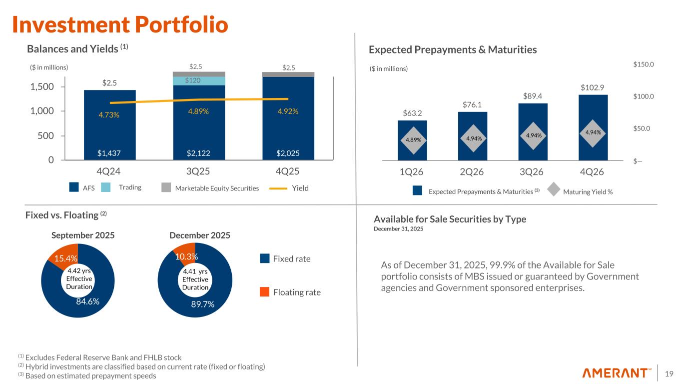 19 89.7% 10.3% $1,437 $2,122 $2,025 $2.5 4.73% 4.89% 4.92% 4Q24 3Q25 4Q25 0 500 1,000 1,500 84.6% 15.4% Balances and Yields (1) AFS Trading Fixed vs. Floating (2) September 2025 December 2025 Floating rate Fixed rate Available for Sale Securities by Type December 31, 2025 4.42 yrs Effective Duration ($ in millions) Marketable Equity Securities (1) Excludes Federal Reserve Bank and FHLB stock (2) Hybrid investments are classified based on current rate (fixed or floating) (3) Based on estimated prepayment speeds Yield 4.41 yrs Effective Duration $63.2 $76.1 $89.4 $102.9 1Q26 2Q26 3Q26 4Q26 $— $50.0 $100.0 $150.0 ($ in millions) Expected Prepayments & Maturities Expected Prepayments & Maturities (3) Maturing Yield % Investment Portfolio 4.89% 4.94% 4.94% 4.94% As of December 31, 2025, 99.9% of the Available for Sale portfolio consists of MBS issued or guaranteed by Government agencies and Government sponsored enterprises. $2.5 $120 $2.5