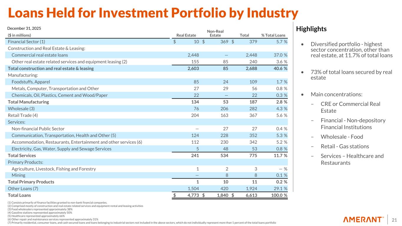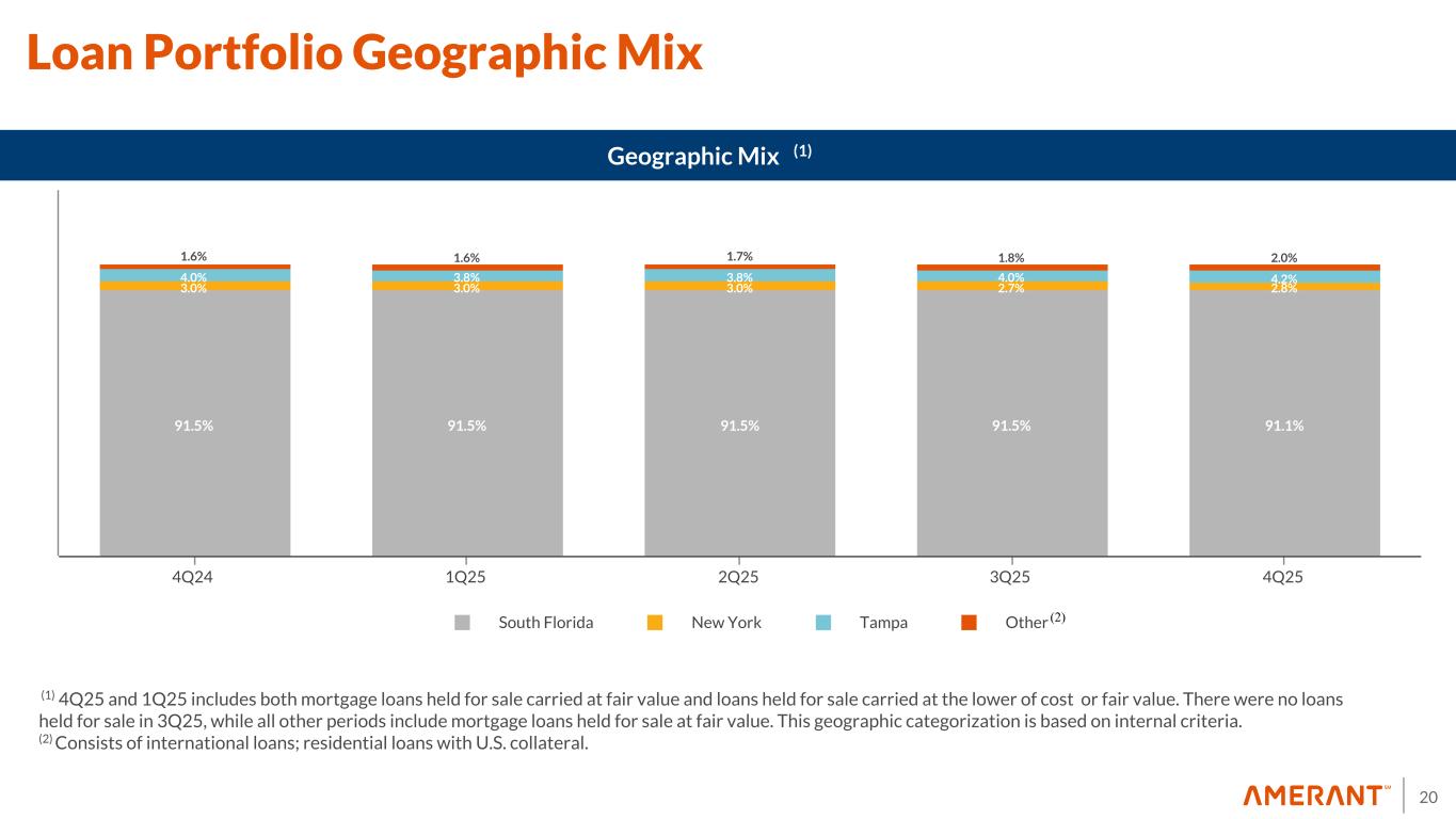 20 91.5% 91.5% 91.5% 91.5% 91.1% 3.0% 3.0% 3.0% 2.7% 2.8% 4.0% 3.8% 3.8% 4.0% 4.2% 1.6% 1.6% 1.7% 1.8% 2.0% South Florida New York Tampa Other 4Q24 1Q25 2Q25 3Q25 4Q25 Geographic Mix (Domestic) Geographic Mix (1) Loan Portfolio Geographic Mix (1) 4Q25 and 1Q25 includes both mortgage loans held for sale carried at fair value and loans held for sale carried at the lower of cost or fair value. There were no loans held for sale in 3Q25, while all other periods include mortgage loans held for sale at fair value. This geographic categorization is based on internal criteria. (2) Consists of international loans; residential loans with U.S. collateral. (2)