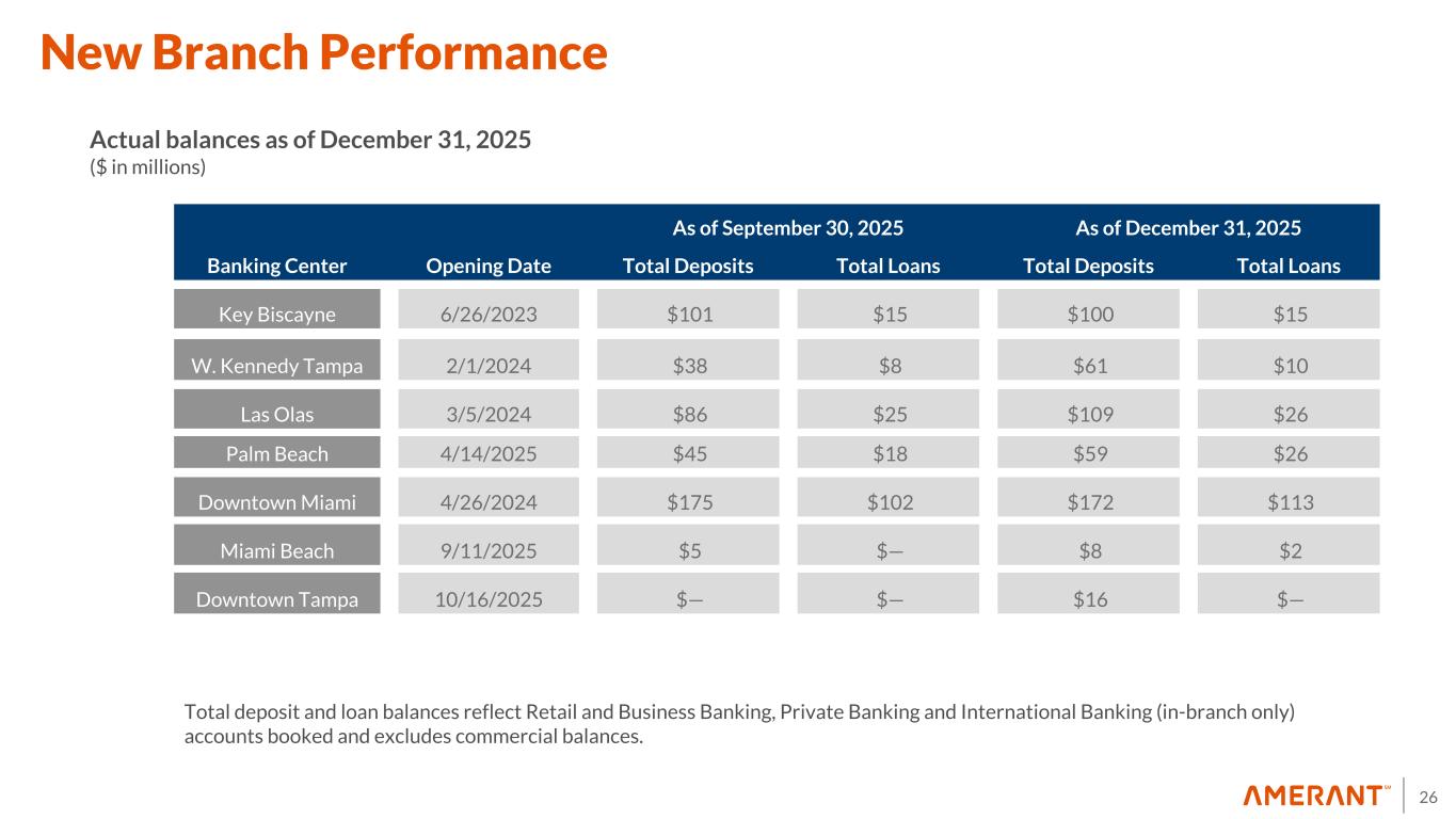 26 New Branch Performance Actual balances as of December 31, 2025 ($ in millions) Total deposit and loan balances reflect Retail and Business Banking, Private Banking and International Banking (in-branch only) accounts booked and excludes commercial balances. As of September 30, 2025 As of December 31, 2025 Banking Center Opening Date Total Deposits Total Loans Total Deposits Total Loans Key Biscayne 6/26/2023 $101 $15 $100 $15 W. Kennedy Tampa 2/1/2024 $38 $8 $61 $10 Las Olas 3/5/2024 $86 $25 $109 $26 Palm Beach 4/14/2025 $45 $18 $59 $26 Downtown Miami 4/26/2024 $175 $102 $172 $113 Miami Beach 9/11/2025 $5 $— $8 $2 Downtown Tampa 10/16/2025 $— $— $16 $—