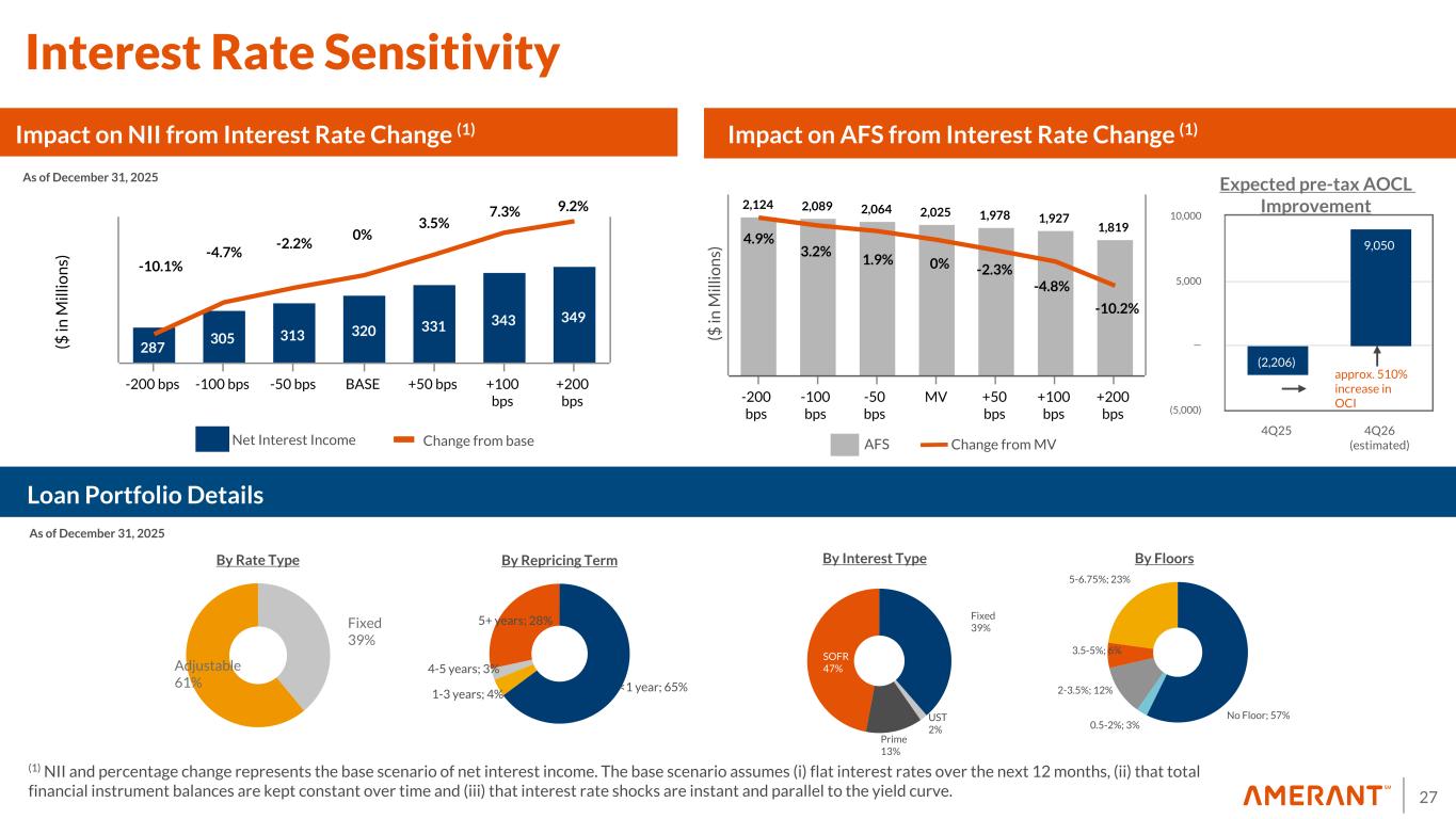27 <1 year; 65% 1-3 years; 4% 4-5 years; 3% 5+ years; 28% 287 305 313 320 331 343 349 -200 bps -100 bps -50 bps BASE +50 bps +100 bps +200 bps As of December 31, 2025 Fixed 39% Adjustable 61% 27 By Interest TypeBy Rate Type By Repricing Term (1) NII and percentage change represents the base scenario of net interest income. The base scenario assumes (i) flat interest rates over the next 12 months, (ii) that total financial instrument balances are kept constant over time and (iii) that interest rate shocks are instant and parallel to the yield curve. Loan Portfolio Details Impact on NII from Interest Rate Change (1) AFSChange from base ($ in M ill io n s) Fixed 39% UST 2% Prime 13% SOFR 47% As of December 31, 2025 Impact on AFS from Interest Rate Change (1) -10.1% -4.7% 0% 7.3% 3.5% -2.2% 9.2% No Floor; 57% 0.5-2%; 3% 2-3.5%; 12% 3.5-5%; 6% 5-6.75%; 23% By Floors 2,124 2,089 2,064 2,025 1,978 1,927 1,819 -200 bps -100 bps -50 bps MV +50 bps +100 bps +200 bps ($ in M ill io n s) 4.9% 3.2% 1.9% 0% -2.3% -4.8% -10.2% Expected pre-tax AOCL Improvement Change from MVNet Interest Income (2,206) 9,050 4Q25 4Q26 (estimated) (5,000) — 5,000 10,000 approx. 510% increase in OCI Interest Rate Sensitivity