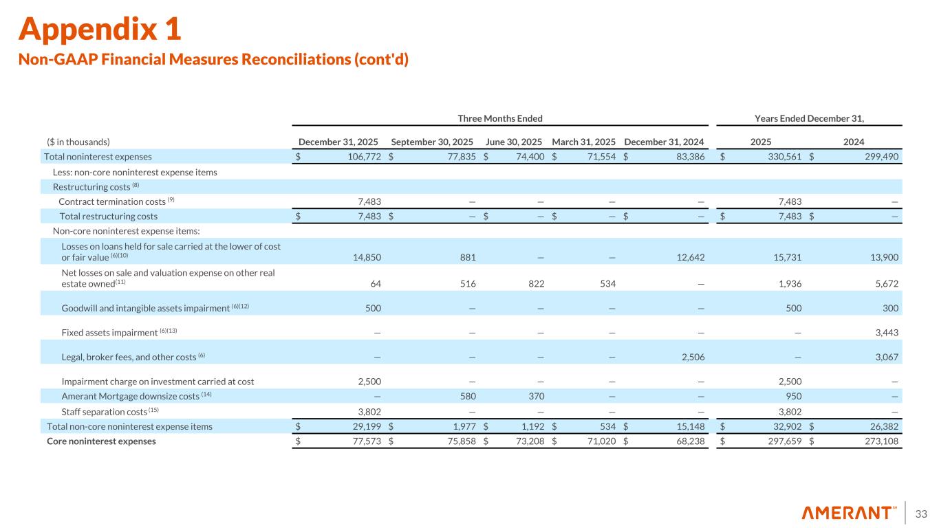 33 Three Months Ended Years Ended December 31, ($ in thousands) December 31, 2025 September 30, 2025 June 30, 2025 March 31, 2025 December 31, 2024 2025 2024 Total noninterest expenses $ 106,772 $ 77,835 $ 74,400 $ 71,554 $ 83,386 $ 330,561 $ 299,490 Less: non-core noninterest expense items Restructuring costs (8) Contract termination costs (9) 7,483 — — — — 7,483 — Total restructuring costs $ 7,483 $ — $ — $ — $ — $ 7,483 $ — Non-core noninterest expense items: Losses on loans held for sale carried at the lower of cost or fair value (6)(10) 14,850 881 — — 12,642 15,731 13,900 Net losses on sale and valuation expense on other real estate owned(11) 64 516 822 534 — 1,936 5,672 Goodwill and intangible assets impairment (6)(12) 500 — — — — 500 300 Fixed assets impairment (6)(13) — — — — — — 3,443 Legal, broker fees, and other costs (6) — — — — 2,506 — 3,067 Impairment charge on investment carried at cost 2,500 — — — — 2,500 — Amerant Mortgage downsize costs (14) — 580 370 — — 950 — Staff separation costs (15) 3,802 — — — — 3,802 — Total non-core noninterest expense items $ 29,199 $ 1,977 $ 1,192 $ 534 $ 15,148 $ 32,902 $ 26,382 Core noninterest expenses $ 77,573 $ 75,858 $ 73,208 $ 71,020 $ 68,238 $ 297,659 $ 273,108 Appendix 1 Non-GAAP Financial Measures Reconciliations (cont'd)