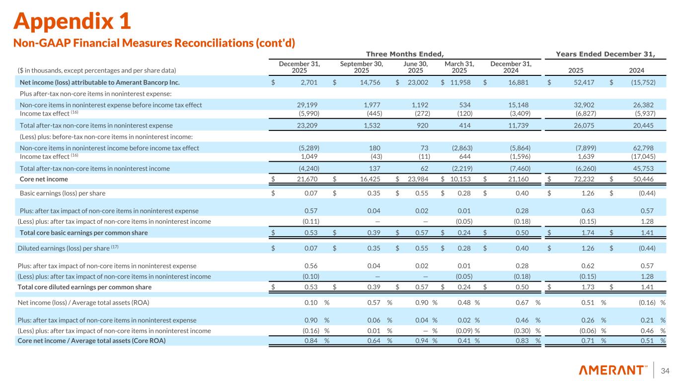 34 Three Months Ended, Years Ended December 31, ($ in thousands, except percentages and per share data) December 31, 2025 September 30, 2025 June 30, 2025 March 31, 2025 December 31, 2024 2025 2024 Net income (loss) attributable to Amerant Bancorp Inc. $ 2,701 $ 14,756 $ 23,002 $ 11,958 $ 16,881 $ 52,417 $ (15,752) Plus after-tax non-core items in noninterest expense: Non-core items in noninterest expense before income tax effect 29,199 1,977 1,192 534 15,148 32,902 26,382 Income tax effect (16) (5,990) (445) (272) (120) (3,409) (6,827) (5,937) Total after-tax non-core items in noninterest expense 23,209 1,532 920 414 11,739 26,075 20,445 (Less) plus: before-tax non-core items in noninterest income: Non-core items in noninterest income before income tax effect (5,289) 180 73 (2,863) (5,864) (7,899) 62,798 Income tax effect (16) 1,049 (43) (11) 644 (1,596) 1,639 (17,045) Total after-tax non-core items in noninterest income (4,240) 137 62 (2,219) (7,460) (6,260) 45,753 Core net income $ 21,670 $ 16,425 $ 23,984 $ 10,153 $ 21,160 $ 72,232 $ 50,446 Basic earnings (loss) per share $ 0.07 $ 0.35 $ 0.55 $ 0.28 $ 0.40 $ 1.26 $ (0.44) Plus: after tax impact of non-core items in noninterest expense 0.57 0.04 0.02 0.01 0.28 0.63 0.57 (Less) plus: after tax impact of non-core items in noninterest income (0.11) — — (0.05) (0.18) (0.15) 1.28 Total core basic earnings per common share $ 0.53 $ 0.39 $ 0.57 $ 0.24 $ 0.50 $ 1.74 $ 1.41 Diluted earnings (loss) per share (17) $ 0.07 $ 0.35 $ 0.55 $ 0.28 $ 0.40 $ 1.26 $ (0.44) Plus: after tax impact of non-core items in noninterest expense 0.56 0.04 0.02 0.01 0.28 0.62 0.57 (Less) plus: after tax impact of non-core items in noninterest income (0.10) — — (0.05) (0.18) (0.15) 1.28 Total core diluted earnings per common share $ 0.53 $ 0.39 $ 0.57 $ 0.24 $ 0.50 $ 1.73 $ 1.41 Net income (loss) / Average total assets (ROA) 0.10 % 0.57 % 0.90 % 0.48 % 0.67 % 0.51 % (0.16) % Plus: after tax impact of non-core items in noninterest expense 0.90 % 0.06 % 0.04 % 0.02 % 0.46 % 0.26 % 0.21 % (Less) plus: after tax impact of non-core items in noninterest income (0.16) % 0.01 % — % (0.09) % (0.30) % (0.06) % 0.46 % Core net income / Average total assets (Core ROA) 0.84 % 0.64 % 0.94 % 0.41 % 0.83 % 0.71 % 0.51 % Appendix 1 Non-GAAP Financial Measures Reconciliations (cont'd)