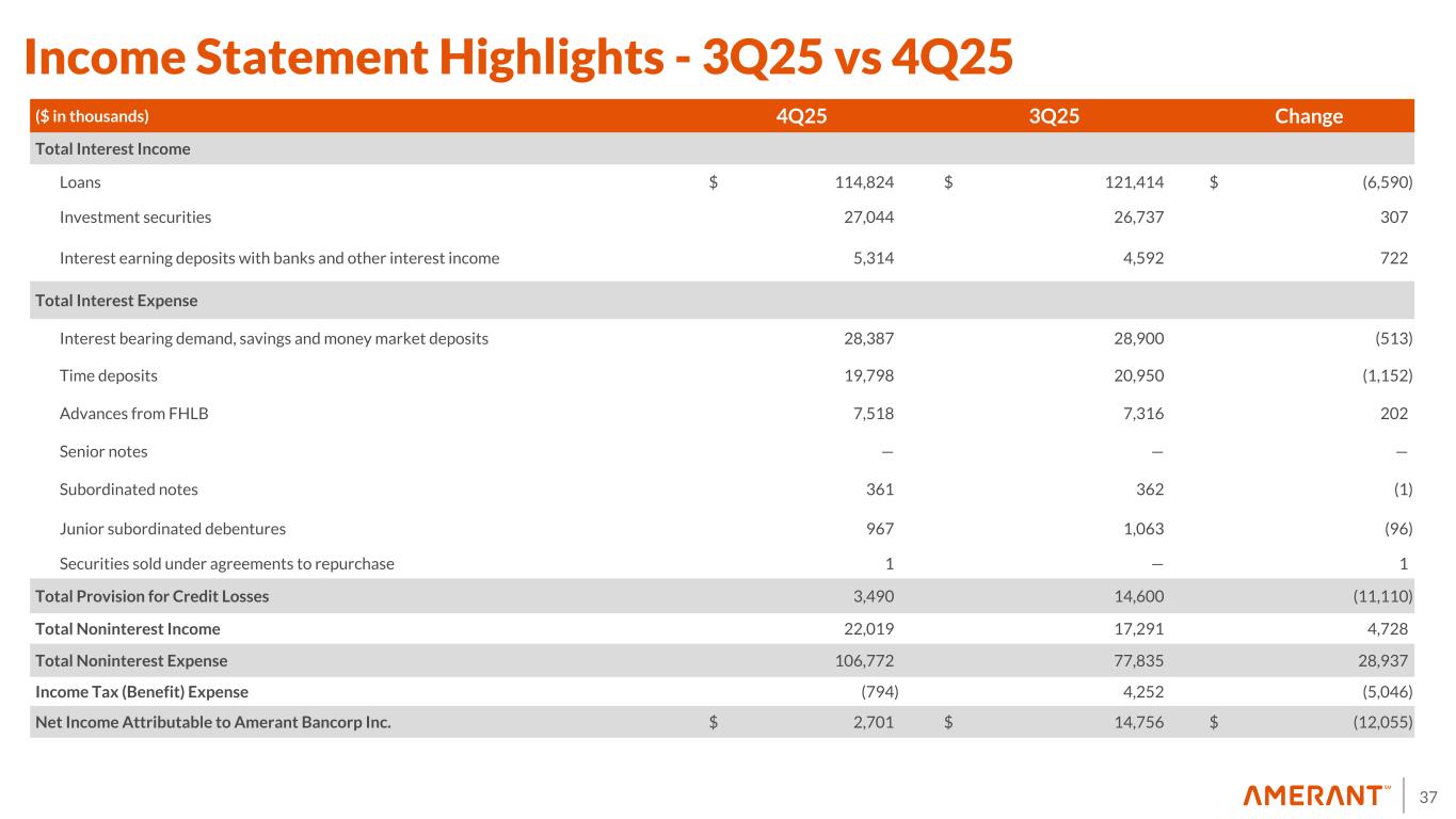 37 Income Statement Highlights - 3Q25 vs 4Q25 ($ in thousands) 4Q25 3Q25 Change Total Interest Income Loans $ 114,824 $ 121,414 $ (6,590) Investment securities 27,044 26,737 307 Interest earning deposits with banks and other interest income 5,314 4,592 722 Total Interest Expense Interest bearing demand, savings and money market deposits 28,387 28,900 (513) Time deposits 19,798 20,950 (1,152) Advances from FHLB 7,518 7,316 202 Senior notes — — — Subordinated notes 361 362 (1) Junior subordinated debentures 967 1,063 (96) Securities sold under agreements to repurchase 1 — 1 Total Provision for Credit Losses 3,490 14,600 (11,110) Total Noninterest Income 22,019 17,291 4,728 Total Noninterest Expense 106,772 77,835 28,937 Income Tax (Benefit) Expense (794) 4,252 (5,046) Net Income Attributable to Amerant Bancorp Inc. $ 2,701 $ 14,756 $ (12,055)