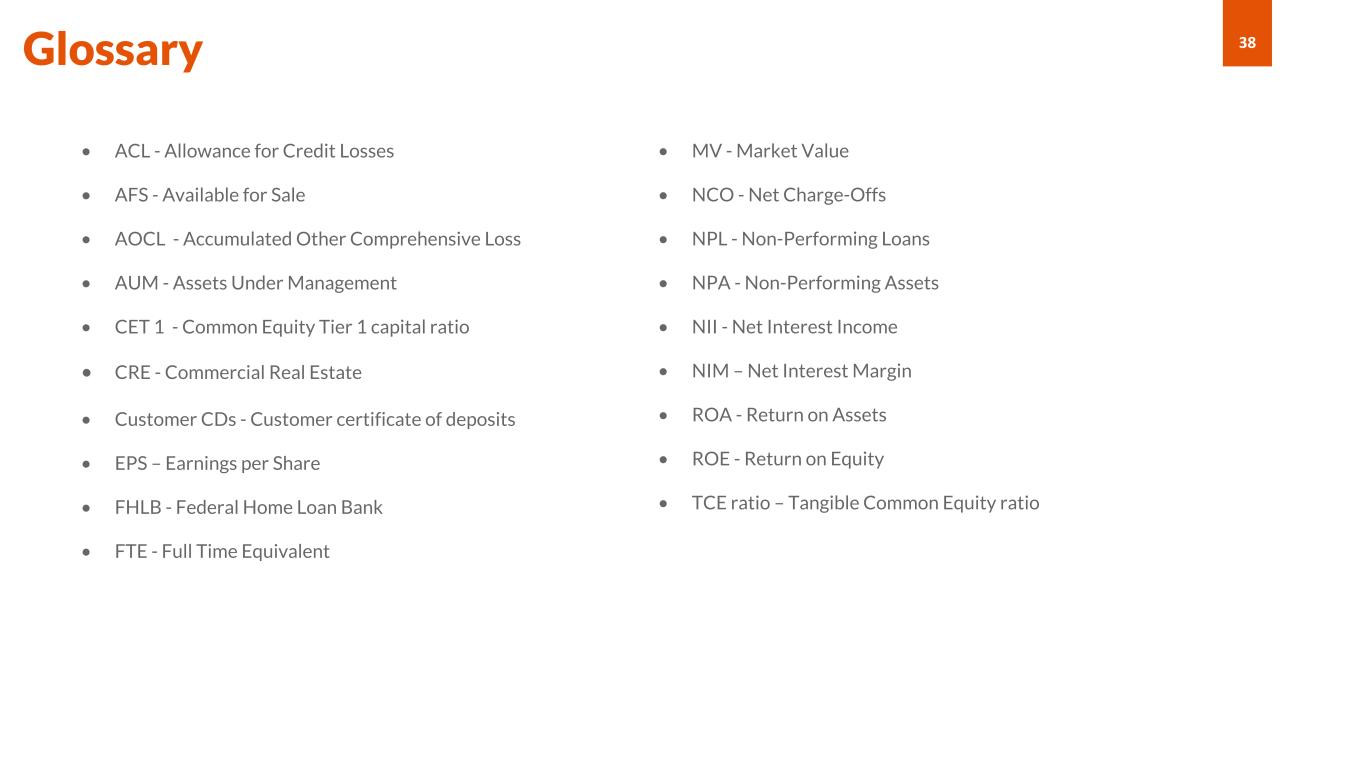 38 • ACL - Allowance for Credit Losses • AFS - Available for Sale • AOCL - Accumulated Other Comprehensive Loss • AUM - Assets Under Management • CET 1 - Common Equity Tier 1 capital ratio • CRE - Commercial Real Estate • Customer CDs - Customer certificate of deposits • EPS – Earnings per Share • FHLB - Federal Home Loan Bank • FTE - Full Time Equivalent • MV - Market Value • NCO - Net Charge-Offs • NPL - Non-Performing Loans • NPA - Non-Performing Assets • NII - Net Interest Income • NIM – Net Interest Margin • ROA - Return on Assets • ROE - Return on Equity • TCE ratio – Tangible Common Equity ratio Glossary