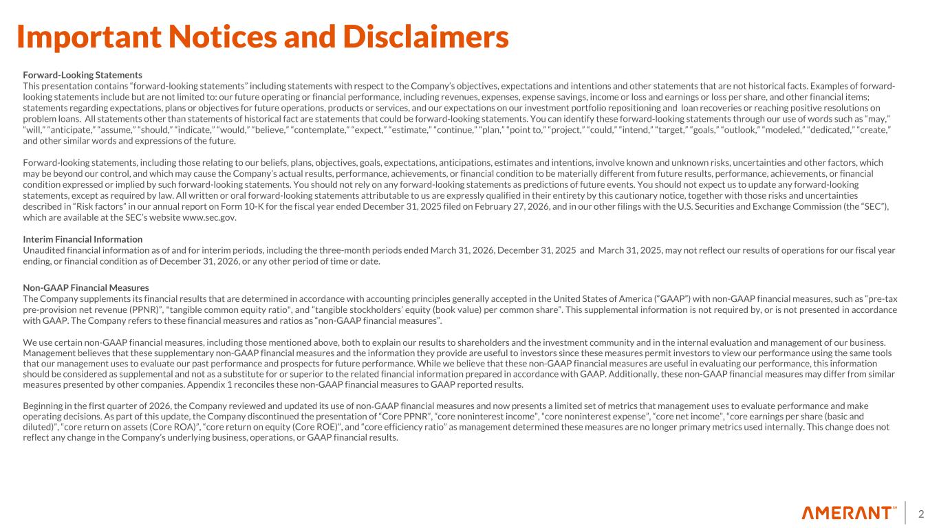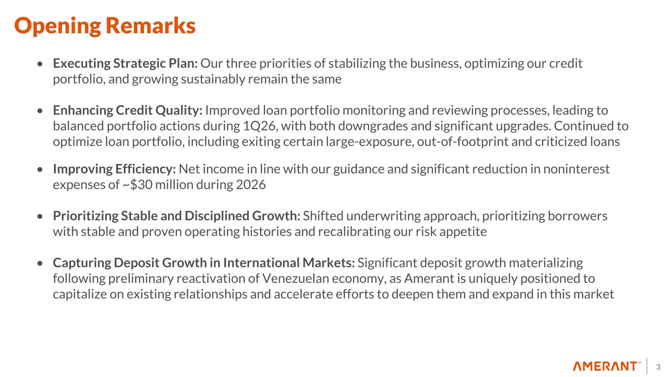 2 Important Notices and Disclaimers Forward-Looking Statements This presentation contains “forward-looking statements” including statements with respect to the Company’s objectives, expectations and intentions and other statements that are not historical facts. Examples of forward- looking statements include but are not limited to: our future operating or financial performance, including revenues, expenses, expense savings, income or loss and earnings or loss per share, and other financial items; statements regarding expectations, plans or objectives for future operations, products or services, and our expectations on our investment portfolio repositioning and loan recoveries or reaching positive resolutions on problem loans. All statements other than statements of historical fact are statements that could be forward-looking statements. You can identify these forward-looking statements through our use of words such as “may,” “will,” “anticipate,” “assume,” “should,” “indicate,” “would,” “believe,” “contemplate,” “expect,” “estimate,” “continue,” “plan,” “point to,” “project,” “could,” “intend,” “target,” “goals,” “outlook,” “modeled,” “dedicated,” “create,” and other similar words and expressions of the future. Forward-looking statements, including those relating to our beliefs, plans, objectives, goals, expectations, anticipations, estimates and intentions, involve known and unknown risks, uncertainties and other factors, which may be beyond our control, and which may cause the Company’s actual results, performance, achievements, or financial condition to be materially different from future results, performance, achievements, or financial condition expressed or implied by such forward-looking statements. You should not rely on any forward-looking statements as predictions of future events. You should not expect us to update any forward-looking statements, except as required by law. All written or oral forward-looking statements attributable to us are expressly qualified in their entirety by this cautionary notice, together with those risks and uncertainties described in “Risk factors” in our annual report on Form 10-K for the fiscal year ended December 31, 2025 filed on February 27, 2026, and in our other filings with the U.S. Securities and Exchange Commission (the “SEC”), which are available at the SEC’s website www.sec.gov. Interim Financial Information Unaudited financial information as of and for interim periods, including the three-month periods ended March 31, 2026, December 31, 2025 and March 31, 2025, may not reflect our results of operations for our fiscal year ending, or financial condition as of December 31, 2026, or any other period of time or date. Non-GAAP Financial Measures The Company supplements its financial results that are determined in accordance with accounting principles generally accepted in the United States of America (“GAAP”) with non-GAAP financial measures, such as “pre-tax pre-provision net revenue (PPNR)”, "tangible common equity ratio", and “tangible stockholders’ equity (book value) per common share”. This supplemental information is not required by, or is not presented in accordance with GAAP. The Company refers to these financial measures and ratios as “non-GAAP financial measures”. We use certain non-GAAP financial measures, including those mentioned above, both to explain our results to shareholders and the investment community and in the internal evaluation and management of our business. Management believes that these supplementary non-GAAP financial measures and the information they provide are useful to investors since these measures permit investors to view our performance using the same tools that our management uses to evaluate our past performance and prospects for future performance. While we believe that these non-GAAP financial measures are useful in evaluating our performance, this information should be considered as supplemental and not as a substitute for or superior to the related financial information prepared in accordance with GAAP. Additionally, these non-GAAP financial measures may differ from similar measures presented by other companies. Appendix 1 reconciles these non-GAAP financial measures to GAAP reported results. Beginning in the first quarter of 2026, the Company reviewed and updated its use of non-GAAP financial measures and now presents a limited set of metrics that management uses to evaluate performance and make operating decisions. As part of this update, the Company discontinued the presentation of “Core PPNR”, “core noninterest income”, “core noninterest expense”, “core net income”, “core earnings per share (basic and diluted)”, “core return on assets (Core ROA)”, “core return on equity (Core ROE)”, and “core efficiency ratio” as management determined these measures are no longer primary metrics used internally. This change does not reflect any change in the Company’s underlying business, operations, or GAAP financial results.