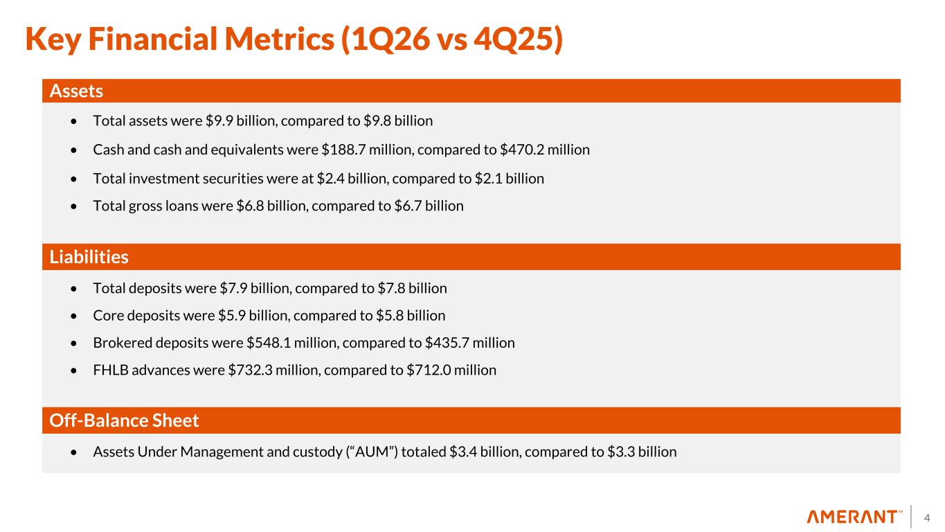 3 • Executing Strategic Plan: Our three priorities of stabilizing the business, optimizing our credit portfolio, and growing sustainably remain the same • Enhancing Credit Quality: Improved loan portfolio monitoring and reviewing processes, leading to balanced portfolio actions during 1Q26, with both downgrades and significant upgrades. Continued to optimize loan portfolio, including exiting certain large-exposure, out-of-footprint and criticized loans • Improving Efficiency: Net income in line with our guidance and significant reduction in noninterest expenses of ~$30 million during 2026 • Prioritizing Stable and Disciplined Growth: Shifted underwriting approach, prioritizing borrowers with stable and proven operating histories and recalibrating our risk appetite • Capturing Deposit Growth in International Markets: Significant deposit growth materializing following preliminary reactivation of Venezuelan economy, as Amerant is uniquely positioned to capitalize on existing relationships and accelerate efforts to deepen them and expand in this market Opening Remarks