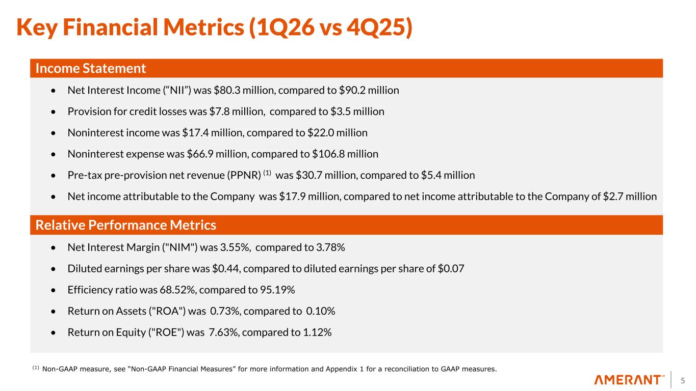 4 Key Financial Metrics (1Q26 vs 4Q25) Assets • Total assets were $9.9 billion, compared to $9.8 billion • Cash and cash and equivalents were $188.7 million, compared to $470.2 million • Total investment securities were at $2.4 billion, compared to $2.1 billion • Total gross loans were $6.8 billion, compared to $6.7 billion Liabilities • Total deposits were $7.9 billion, compared to $7.8 billion • Core deposits were $5.9 billion, compared to $5.8 billion • Brokered deposits were $548.1 million, compared to $435.7 million • FHLB advances were $732.3 million, compared to $712.0 million Off-Balance Sheet • Assets Under Management and custody (“AUM”) totaled $3.4 billion, compared to $3.3 billion