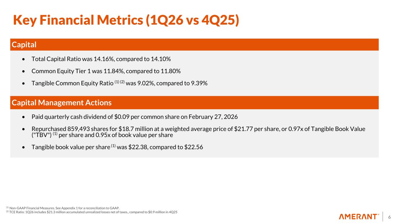 5 Key Financial Metrics (1Q26 vs 4Q25) Income Statement • Net Interest Income (“NII”) was $80.3 million, compared to $90.2 million • Provision for credit losses was $7.8 million, compared to $3.5 million • Noninterest income was $17.4 million, compared to $22.0 million • Noninterest expense was $66.9 million, compared to $106.8 million • Pre-tax pre-provision net revenue (PPNR) (1) was $30.7 million, compared to $5.4 million • Net income attributable to the Company was $17.9 million, compared to net income attributable to the Company of $2.7 million Relative Performance Metrics • Net Interest Margin ("NIM") was 3.55%, compared to 3.78% • Diluted earnings per share was $0.44, compared to diluted earnings per share of $0.07 • Efficiency ratio was 68.52%, compared to 95.19% • Return on Assets ("ROA") was 0.73%, compared to 0.10% • Return on Equity ("ROE") was 7.63%, compared to 1.12% (1) Non-GAAP measure, see “Non-GAAP Financial Measures” for more information and Appendix 1 for a reconciliation to GAAP measures.
