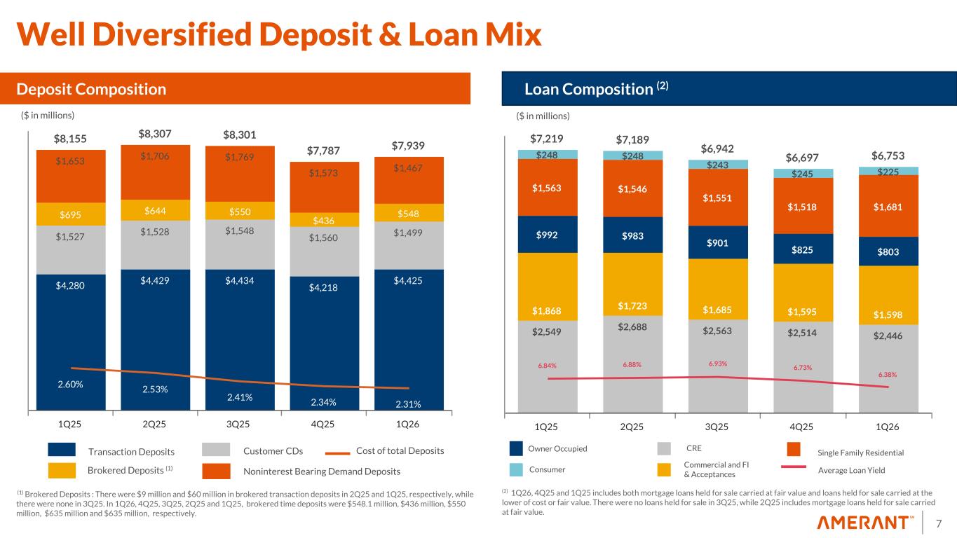 6 Key Financial Metrics (1Q26 vs 4Q25) (1) Non-GAAP Financial Measures. See Appendix 1 for a reconciliation to GAAP. (2) TCE Ratio: 1Q26 includes $21.3 million accumulated unrealized losses net of taxes., compared to $0.9 million in 4Q25 Capital • Total Capital Ratio was 14.16%, compared to 14.10% • Common Equity Tier 1 was 11.84%, compared to 11.80% • Tangible Common Equity Ratio (1) (2) was 9.02%, compared to 9.39% Capital Management Actions • Paid quarterly cash dividend of $0.09 per common share on February 27, 2026 • Repurchased 859,493 shares for $18.7 million at a weighted average price of $21.77 per share, or 0.97x of Tangible Book Value ("TBV") (1) per share and 0.95x of book value per share • Tangible book value per share (1) was $22.38, compared to $22.56