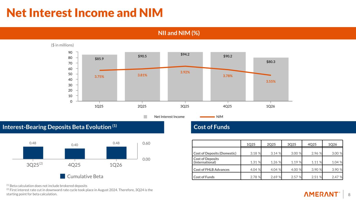7 $8,155 $8,307 $8,301 $7,787 $7,939 $4,280 $4,429 $4,434 $4,218 $4,425 $1,527 $1,528 $1,548 $1,560 $1,499 $695 $644 $550 $436 $548 $1,653 $1,706 $1,769 $1,573 $1,467 2.60% 2.53% 2.41% 2.34% 2.31% 1Q25 2Q25 3Q25 4Q25 1Q26 Deposit Composition Loan Composition (2) Transaction Deposits Customer CDs Brokered Deposits (1) Cost of total Deposits ($ in millions) Noninterest Bearing Demand Deposits Well Diversified Deposit & Loan Mix (1) Brokered Deposits : There were $9 million and $60 million in brokered transaction deposits in 2Q25 and 1Q25, respectively, while there were none in 3Q25. In 1Q26, 4Q25, 3Q25, 2Q25 and 1Q25, brokered time deposits were $548.1 million, $436 million, $550 million, $635 million and $635 million, respectively. $7,219 $7,189 $6,942 $6,697 $6,753 $2,549 $2,688 $2,563 $2,514 $2,446 $1,868 $1,723 $1,685 $1,595 $1,598 $992 $983 $901 $825 $803 $1,563 $1,546 $1,551 $1,518 $1,681 $248 $248 $243 $245 $225 6.84% 6.88% 6.93% 6.73% 6.38% 1Q25 2Q25 3Q25 4Q25 1Q26 Consumer CRE Commercial and FI & Acceptances Owner Occupied Single Family Residential Average Loan Yield ($ in millions) (2) 1Q26, 4Q25 and 1Q25 includes both mortgage loans held for sale carried at fair value and loans held for sale carried at the lower of cost or fair value. There were no loans held for sale in 3Q25, while 2Q25 includes mortgage loans held for sale carried at fair value.