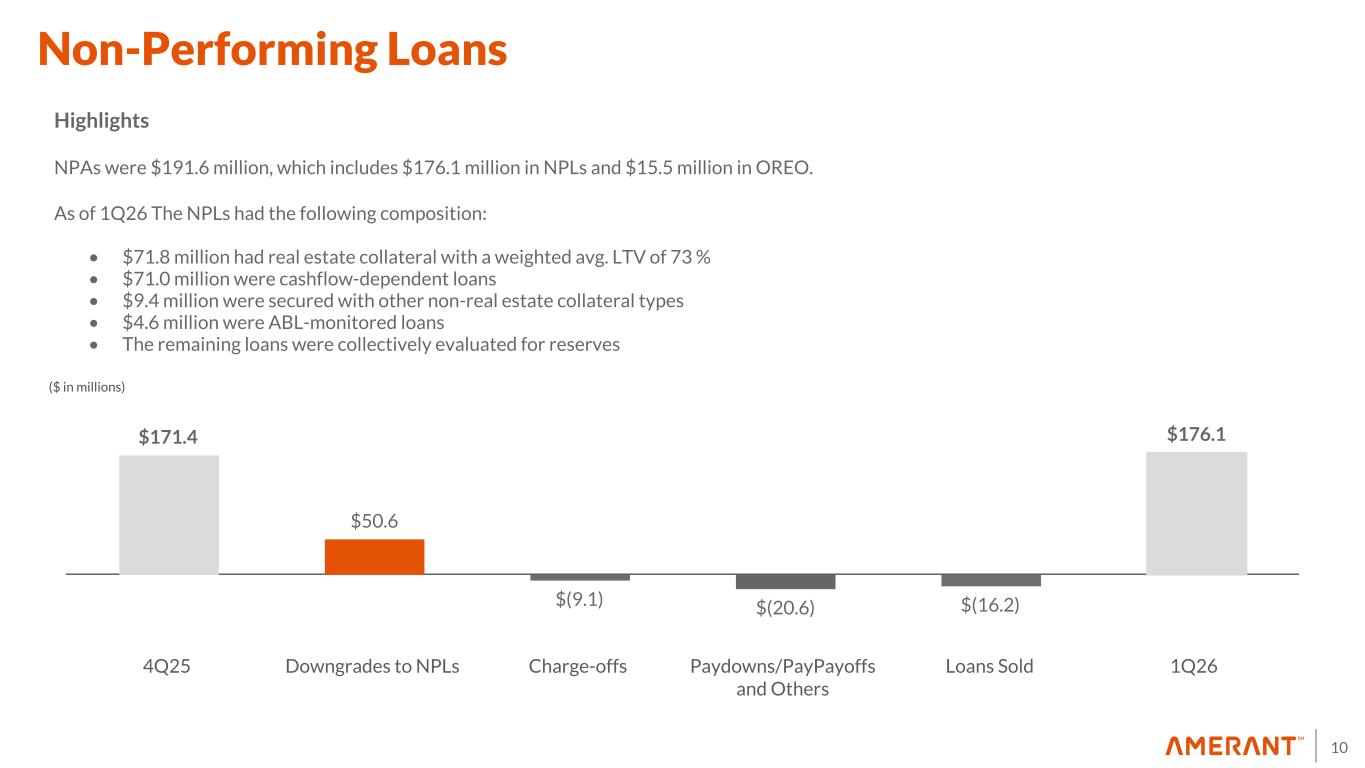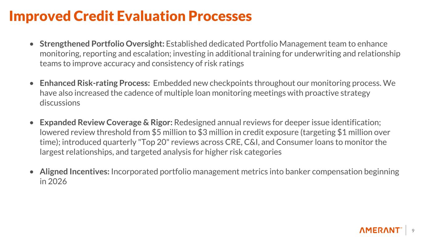 9 • Strengthened Portfolio Oversight: Established dedicated Portfolio Management team to enhance monitoring, reporting and escalation; investing in additional training for underwriting and relationship teams to improve accuracy and consistency of risk ratings • Enhanced Risk-rating Process: Embedded new checkpoints throughout our monitoring process. We have also increased the cadence of multiple loan monitoring meetings with proactive strategy discussions • Expanded Review Coverage & Rigor: Redesigned annual reviews for deeper issue identification; lowered review threshold from $5 million to $3 million in credit exposure (targeting $1 million over time); introduced quarterly "Top 20" reviews across CRE, C&I, and Consumer loans to monitor the largest relationships, and targeted analysis for higher risk categories • Aligned Incentives: Incorporated portfolio management metrics into banker compensation beginning in 2026 Improved Credit Evaluation Processes