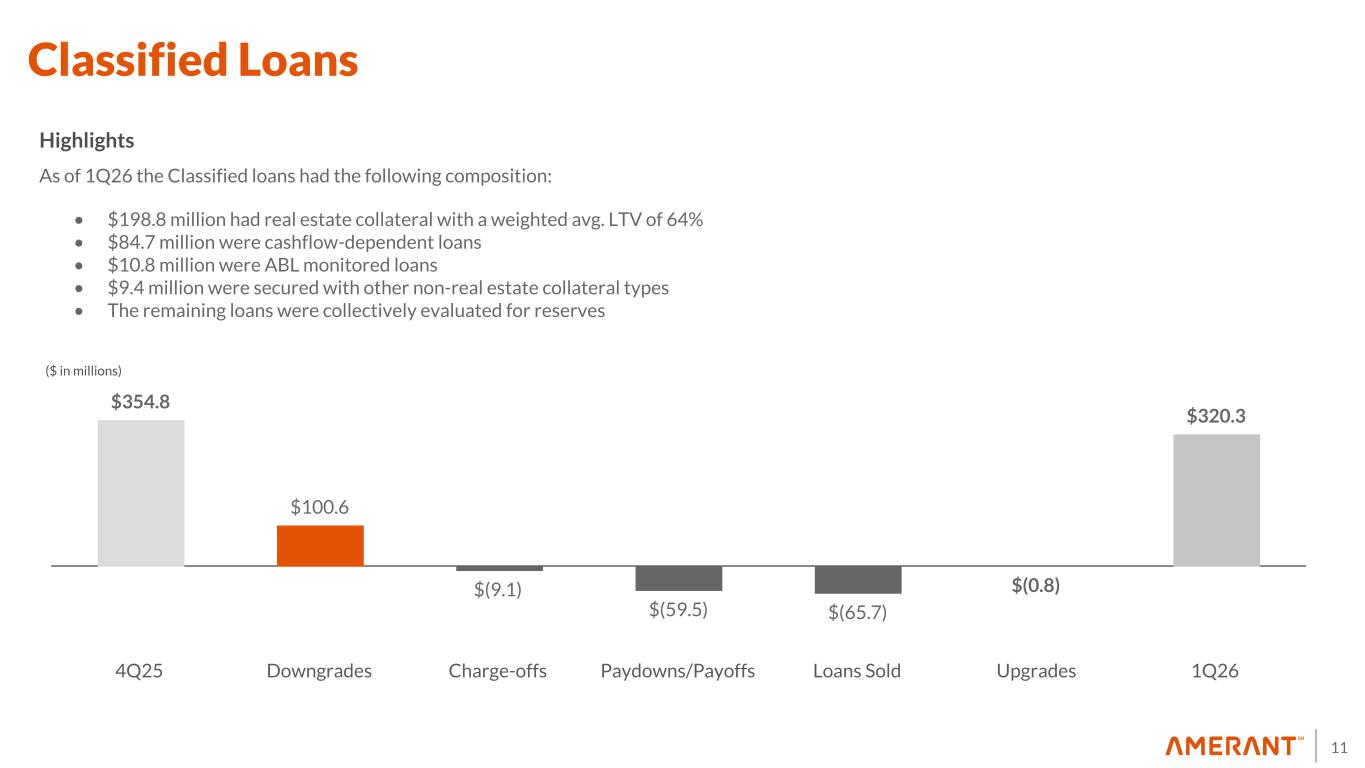10 Non-Performing Loans ($ in millions) $171.4 $50.6 $(9.1) $(20.6) $(16.2) $176.1 4Q25 Downgrades to NPLs Charge-offs Paydowns/PayPayoffs and Others Loans Sold 1Q26 Highlights NPAs were $191.6 million, which includes $176.1 million in NPLs and $15.5 million in OREO. As of 1Q26 The NPLs had the following composition: • $71.8 million had real estate collateral with a weighted avg. LTV of 73 % • $71.0 million were cashflow-dependent loans • $9.4 million were secured with other non-real estate collateral types • $4.6 million were ABL-monitored loans • The remaining loans were collectively evaluated for reserves