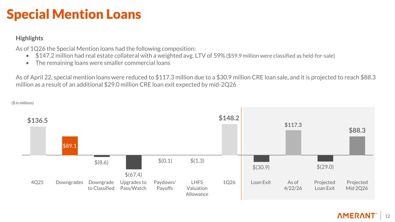11 Classified Loans $354.8 $100.6 $(9.1) $(59.5) $(65.7) $(0.8) $320.3 4Q25 Downgrades Charge-offs Paydowns/Payoffs Loans Sold Upgrades 1Q26 ($ in millions) Highlights As of 1Q26 the Classified loans had the following composition: • $198.8 million had real estate collateral with a weighted avg. LTV of 64% • $84.7 million were cashflow-dependent loans • $10.8 million were ABL monitored loans • $9.4 million were secured with other non-real estate collateral types • The remaining loans were collectively evaluated for reserves