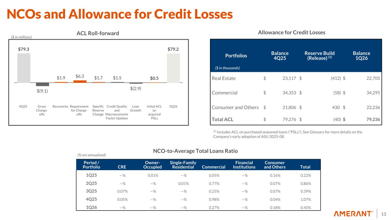 12 Special Mention Loans $136.5 $89.1 $(8.6) $(67.4) $(0.1) $(1.3) $148.2 $(30.9) $117.3 $(29.0) $88.3 4Q25 Downgrades Downgrade to Classified Upgrades to Pass/Watch Paydown/ Payoffs LHFS Valuation Allowance 1Q26 Loan Exit As of 4/22/26 Projected Loan Exit Projected Mid 2Q26 ($ in millions) Highlights As of 1Q26 the Special Mention loans had the following composition: • $147.2 million had real estate collateral with a weighted avg. LTV of 59% ($59.9 million were classified as held-for-sale) • The remaining loans were smaller commercial loans As of April 22, special mention loans were reduced to $117.3 million due to a $30.9 million CRE loan sale, and it is projected to reach $88.3 million as a result of an additional $29.0 million CRE loan exit expected by mid-2Q26 ---------------------------------------------------