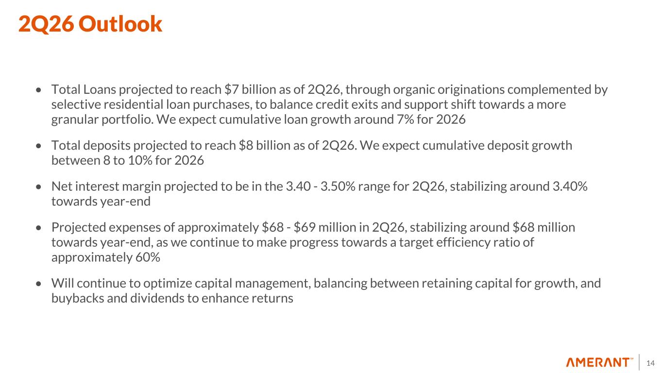 13 NCOs and Allowance for Credit Losses $79.3 $(9.1) $1.9 $6.3 $1.7 $1.5 $(2.9) $0.5 $79.2 4Q25 Gross Charge- offs Recoveries Requirement for Charge- offs Specific Reserve Change Credit Quality and Macroeconomic Factor Updates Loan Growth Initial ACL on acquired PSLs 1Q26 Portfolios Balance 4Q25 Reserve Build (Release) (1) Balance 1Q26 Real Estate $ 23,117 $ (412) $ 22,705 Commercial $ 34,353 $ (58) $ 34,295 Consumer and Others $ 21,806 $ 430 $ 22,236 Total ACL $ 79,276 $ (40) $ 79,236 ACL Roll-forward Allowance for Credit Losses NCO-to-Average Total Loans Ratio ($ in millions) Period / Portfolio CRE Owner- Occupied Single-Family Residential Commercial Financial Institutions Consumer and Others Total 1Q25 —% 0.01% —% 0.05% —% 0.16% 0.22% 2Q25 —% —% 0.01% 0.77% —% 0.07% 0.86% 3Q25 0.07% —% —% 0.25% —% 0.07% 0.39% 4Q25 0.05% —% —% 0.98% —% 0.04% 1.07% 1Q26 —% —% —% 0.27% —% 0.18% 0.45% ($ in thousands) (% are annualized) (1) Includes ACL on purchased seasoned loans ("PSLs"). See Glossary for more details on the Company's early adoption of ASU 2025-08.