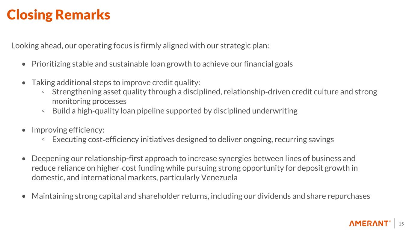15 Looking ahead, our operating focus is firmly aligned with our strategic plan: • Prioritizing stable and sustainable loan growth to achieve our financial goals • Taking additional steps to improve credit quality: ◦ Strengthening asset quality through a disciplined, relationship-driven credit culture and strong monitoring processes ◦ Build a high-quality loan pipeline supported by disciplined underwriting • Improving efficiency: ◦ Executing cost-efficiency initiatives designed to deliver ongoing, recurring savings • Deepening our relationship-first approach to increase synergies between lines of business and reduce reliance on higher-cost funding while pursuing strong opportunity for deposit growth in domestic, and international markets, particularly Venezuela • Maintaining strong capital and shareholder returns, including our dividends and share repurchases Closing Remarks