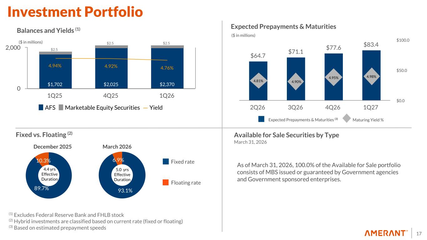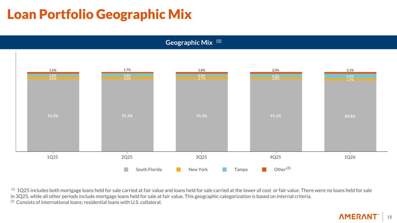 17 93.1% 6.9% $1,702 $2,025 $2,370 4.94% 4.92% 4.76% AFS Marketable Equity Securities Yield 1Q25 4Q25 1Q26 0 2,000 89.7% 10.3% Balances and Yields (1) Fixed vs. Floating (2) March 2026 Floating rate Fixed rate Available for Sale Securities by Type March 31, 2026 4.4 yrs Effective Duration ($ in millions) (1) Excludes Federal Reserve Bank and FHLB stock (2) Hybrid investments are classified based on current rate (fixed or floating) (3) Based on estimated prepayment speeds 5.0 yrs Effective Duration $64.7 $71.1 $77.6 $83.4 2Q26 3Q26 4Q26 1Q27 $0.0 $50.0 $100.0 ($ in millions) Expected Prepayments & Maturities Expected Prepayments & Maturities (3) Maturing Yield % Investment Portfolio 4.81% 4.90% 4.95% 4.98% December 2025 As of March 31, 2026, 100.0% of the Available for Sale portfolio consists of MBS issued or guaranteed by Government agencies and Government sponsored enterprises. $2.5 $2.5 $2.5