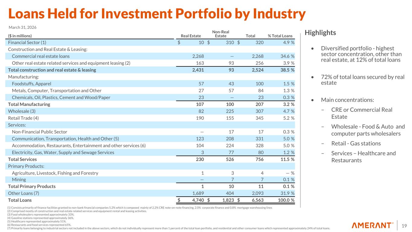 18 91.5% 91.5% 91.5% 91.1% 89.8% 3.0% 3.0% 2.7% 2.8% 2.7% 3.8% 3.8% 4.0% 4.2% 5.4% 1.6% 1.7% 1.8% 2.0% 2.1% South Florida New York Tampa Other 1Q25 2Q25 3Q25 4Q25 1Q26 Geographic Mix (Domestic) Geographic Mix (1) Loan Portfolio Geographic Mix (1) 1Q25 includes both mortgage loans held for sale carried at fair value and loans held for sale carried at the lower of cost or fair value. There were no loans held for sale in 3Q25, while all other periods include mortgage loans held for sale at fair value. This geographic categorization is based on internal criteria. (2) Consists of international loans; residential loans with U.S. collateral. (2)